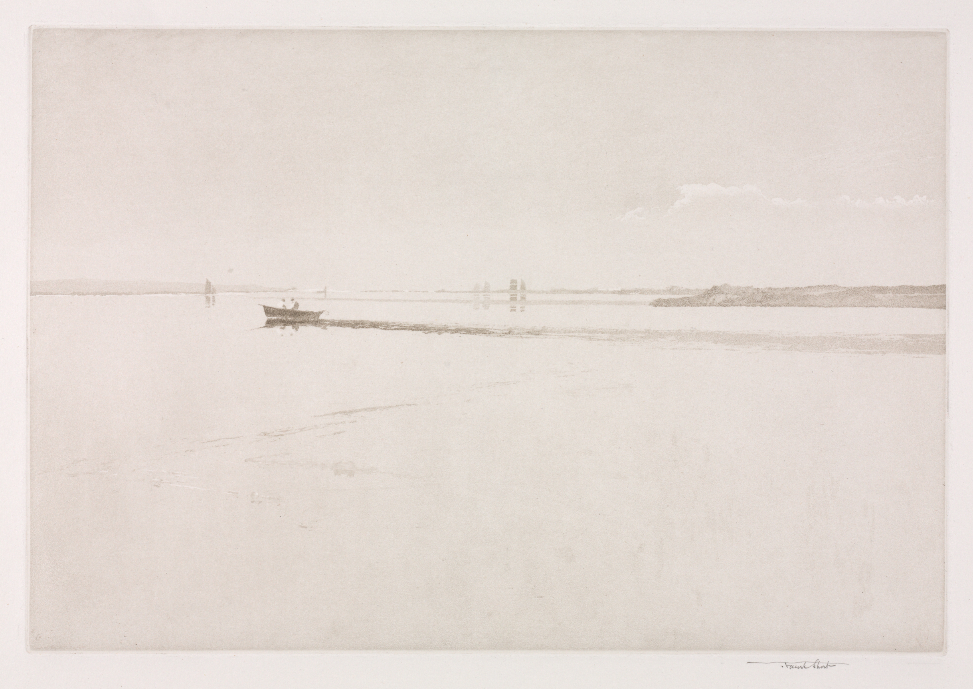 The painting depicts a serene scene with a boat on the water. The boat is on the left side, with two people in it. The water is calm and reflects the light from the sky. In the background, there are indistinct land masses on the horizon. The sky above is light-colored with some clouds on the right side. The overall color palette is muted, with shades of beige and gray dominating the scene. The artist's signature is visible at the bottom right corner.