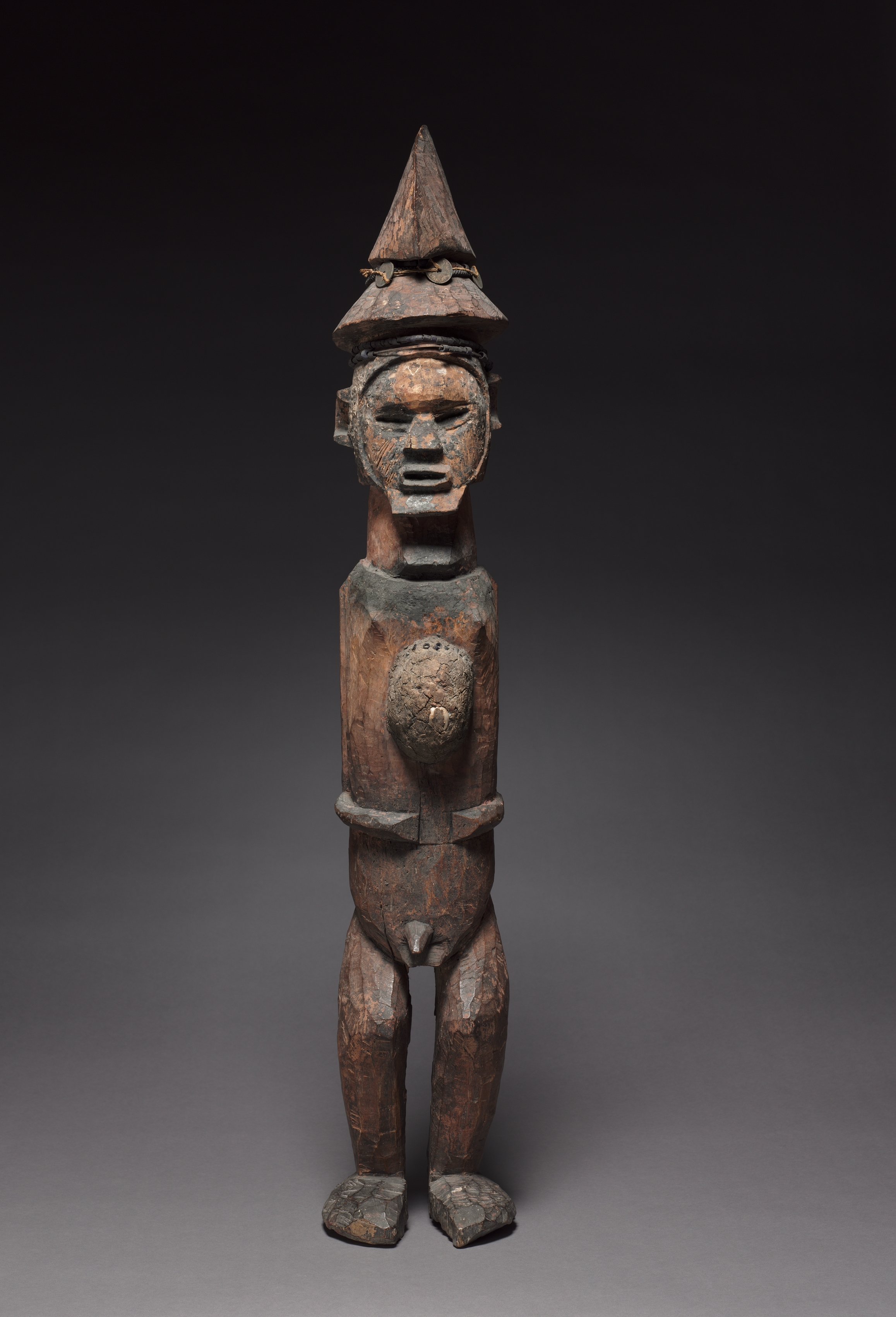 A wooden figure. The figure is standing on two feet, legs straight. The feet are flat and rounded. The body is rectangular and smooth. The breasts are protruding. The arms are straight along the body. The face is rectangular with a protruding forehead. The eyes are closed slits. The figure has a large nose. On the head is a tall, pointed hat or headdress. The background is dark gray. The overall color of the figure is dark brown with some lighter spots. Title: Male Figure Artist: Unknown.