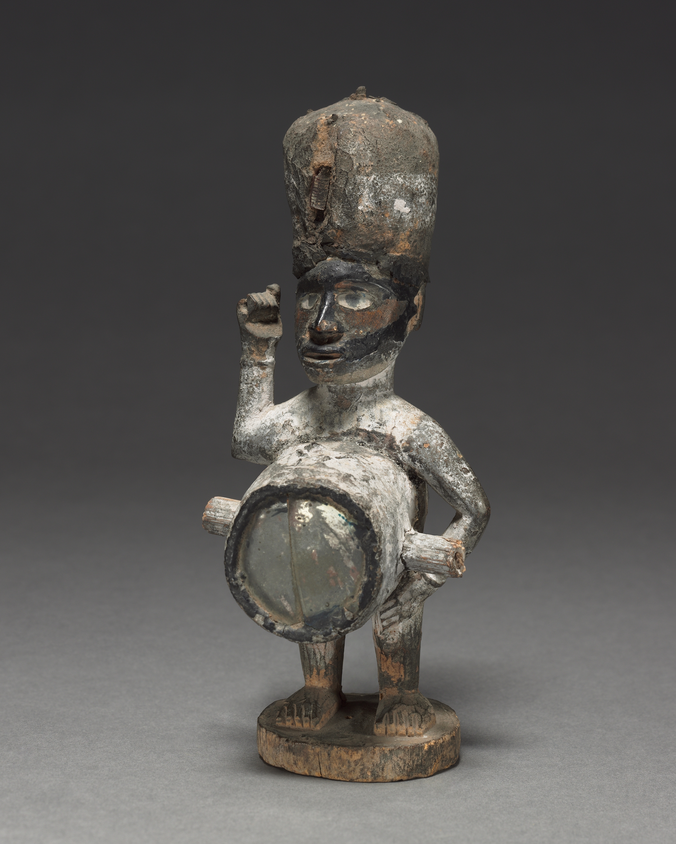 The Power figure (nkisi) depicts a humanoid figure made of wood with a large headpiece. The figure has a large, tall headpiece that is dome-shaped. The figure's face is carved with a neutral expression, featuring a small mouth and eyes. The body is rendered with a large drum in front. The figure stands on a circular base. The entire piece exhibits a weathered appearance with visible signs of aging and wear, including patches of dark and light gray and brown. The figure's right hand is raised, and the left hand rests on the drum.
