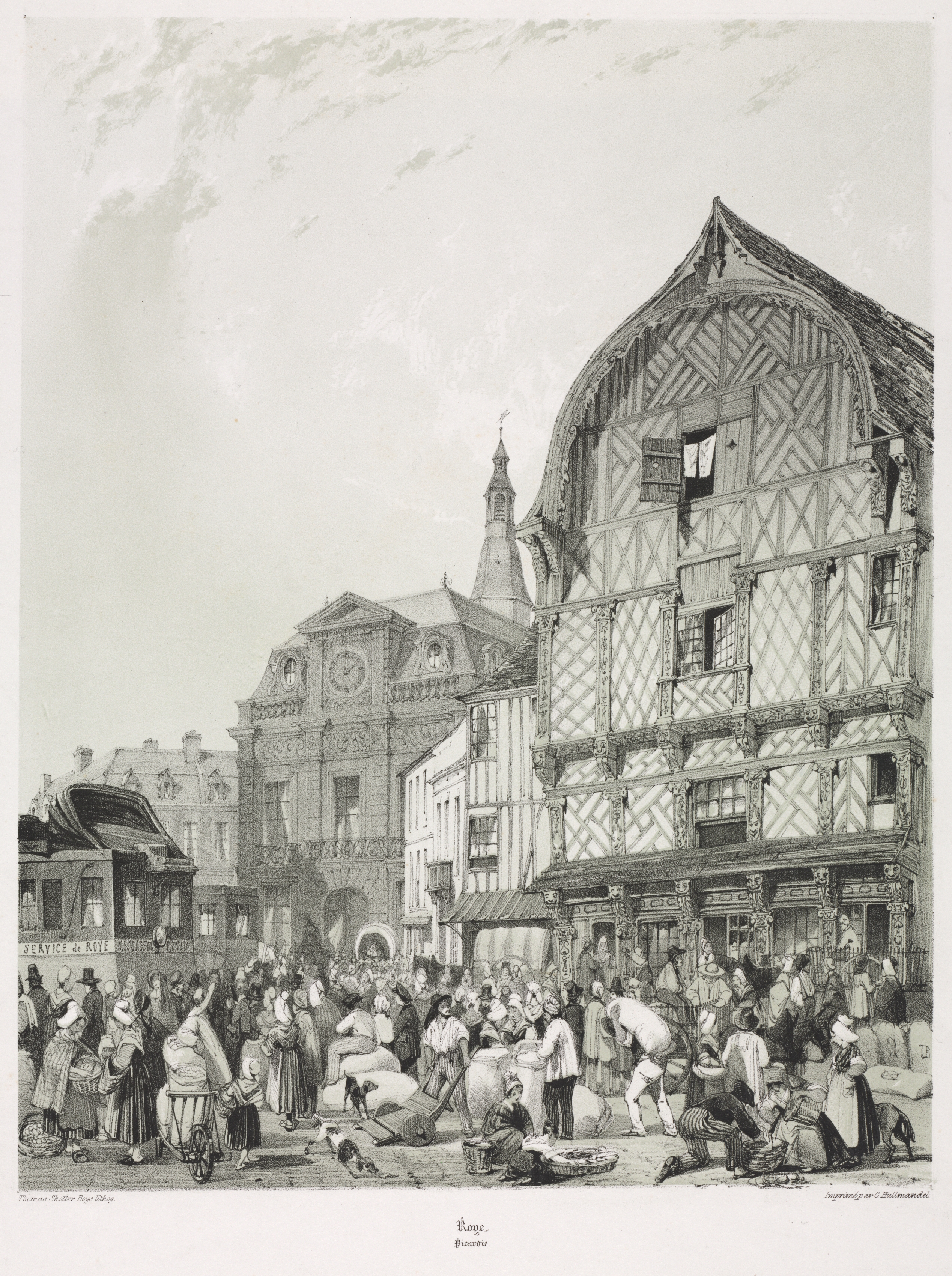 Black and white illustration of a crowded town square. Large half-timbered building with steeply pitched roof and decorative facade on right. Building has multiple stories with windows and ornate woodwork. People of various ages and occupations gathered in square. Some people wearing old-fashioned clothing, hats, and headscarves. Market scene with baskets, goods, and a dog. Buildings in background include a clock tower and other structures with varied architectural details. Sky is light with faint clouds. Text at bottom center of image reads "Roye".