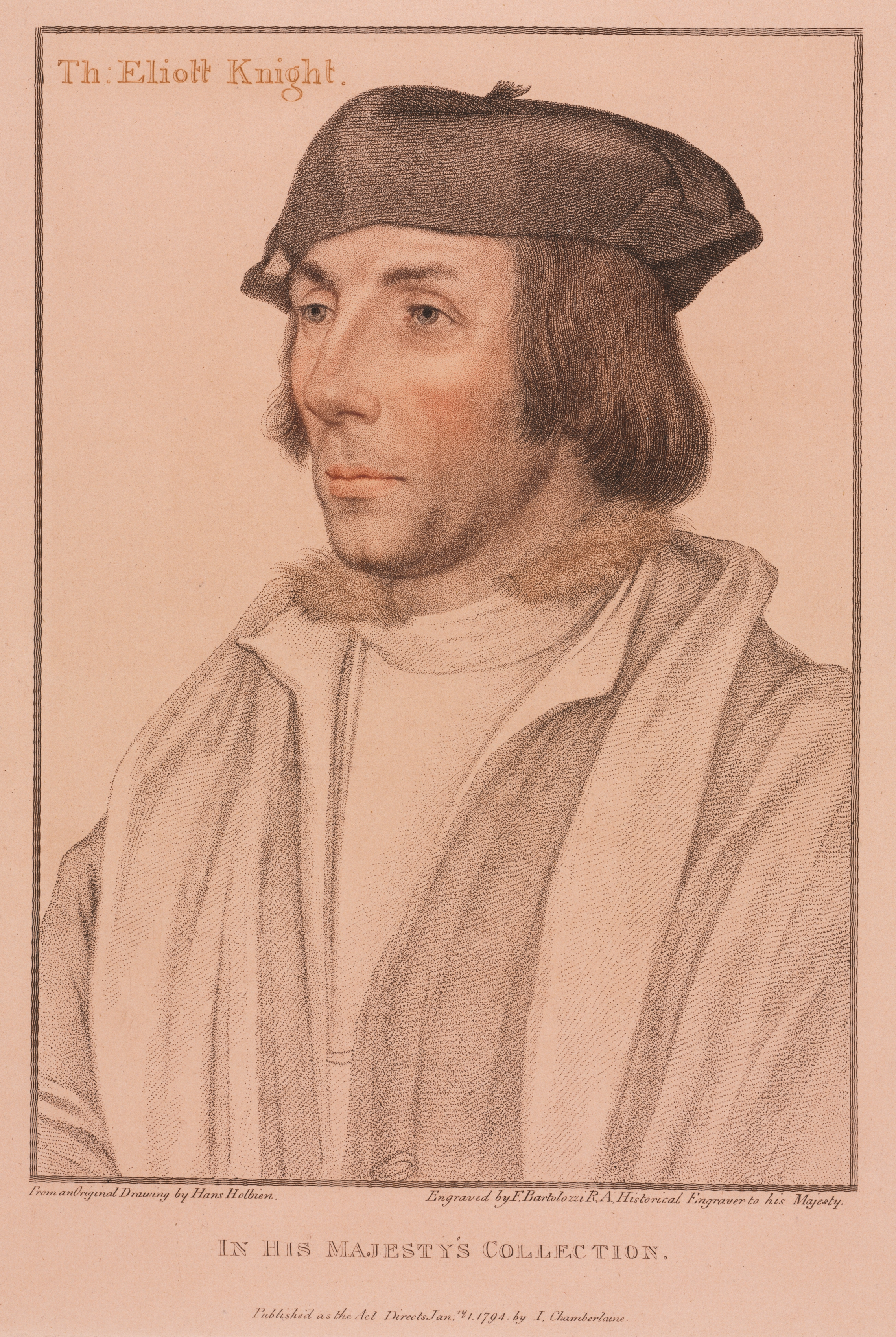 The image features a portrait of Sir Thomas Elyot. He has shoulder-length brown hair and wears a brown cap, a white shirt with a high collar and a fur trim, and a light-colored robe or cloak over the shirt. The portrait is rendered in sepia tones. The background of the portrait is light brown. The portrait is framed by a thin border. In the top left corner, "Th: Eliott Knight" is written in orange text. At the bottom, "IN HIS MAJESTY'S COLLECTION" is printed. Additional text is present at the bottom but is illegible.
