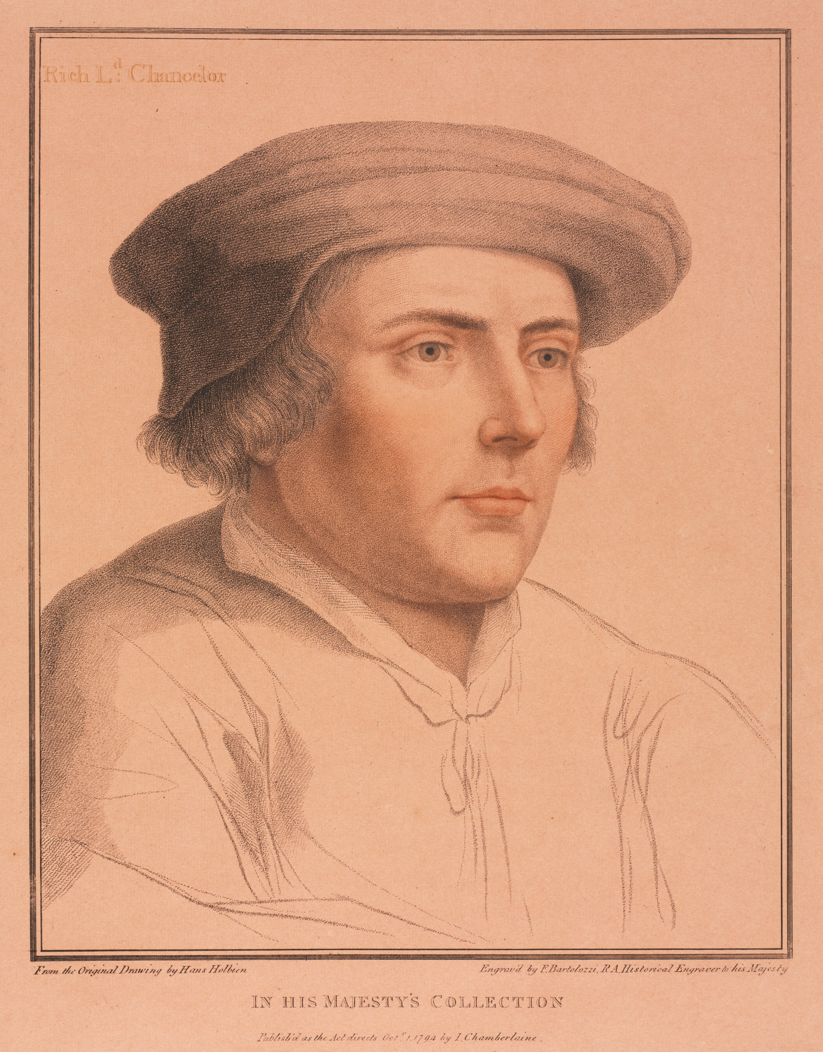 The portrait is a sepia-toned engraving of a man wearing a hat and a collared shirt. The man has fair skin, brown eyes, and short, wavy brown hair. He wears a round hat that covers his forehead and ears. His shirt has a ruffled collar and a bow at the top. The image is framed by a thin black line. In the top left corner, there is text that reads "Rich L. Chancellor". At the bottom, there is a line of text that reads "IN HIS MAJESTY'S COLLECTION". The background of the image is a solid light brown color.