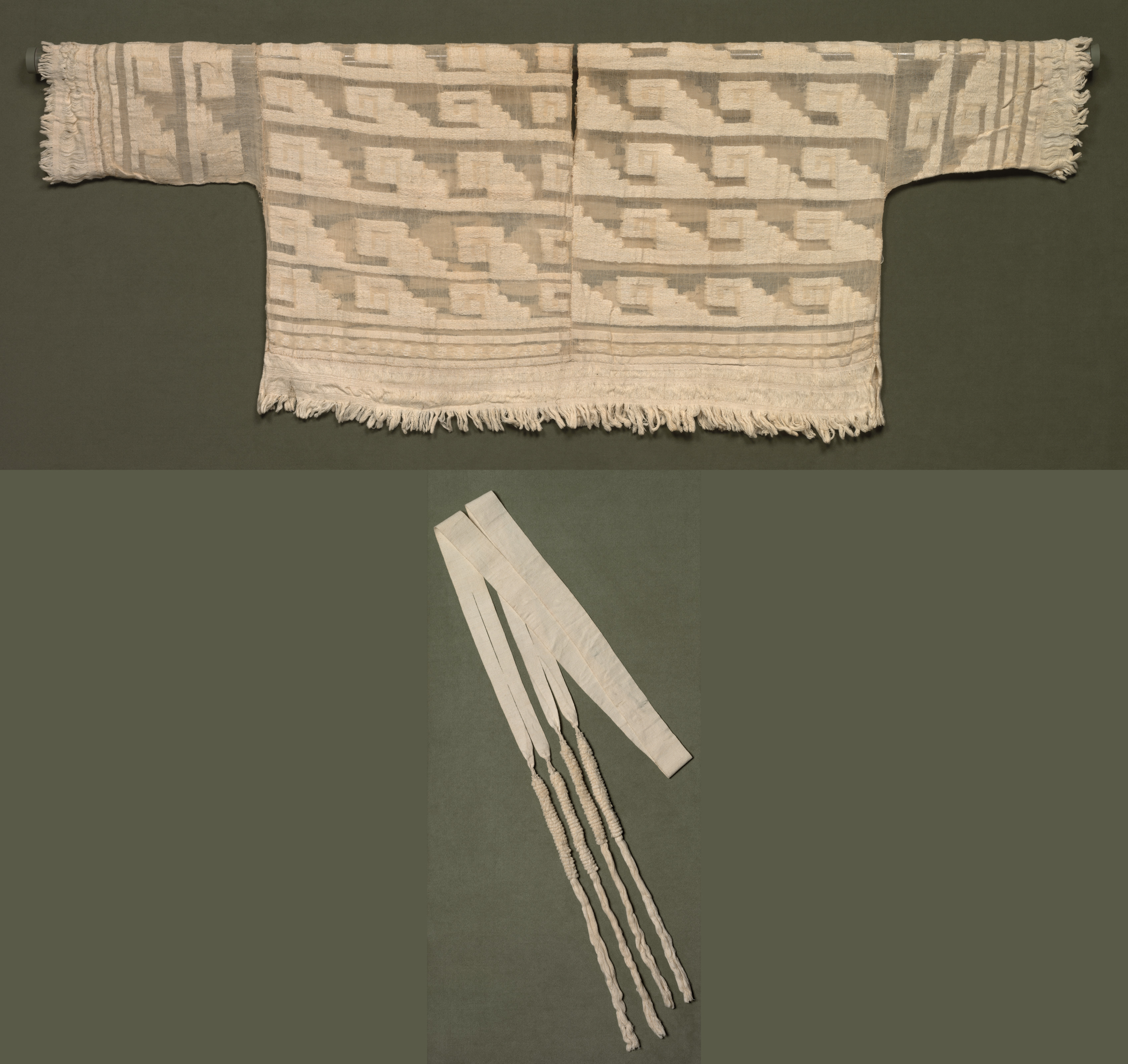 The image shows a short-sleeved tunic with a geometric pattern and tassels, titled "Tunic and Band" by an unknown artist. The tunic is off-white with a geometric pattern in shades of beige and gray. The garment has short sleeves, a straight bottom edge with tassels, and a vertical slit down the center. The sleeves have frayed edges. Below the tunic, there are several long, thin strips of fabric with tassels on the ends. The background of the image is dark green. The image appears to be a product photo or a museum exhibit. The overall design and color palette suggest a traditional or cultural garment.