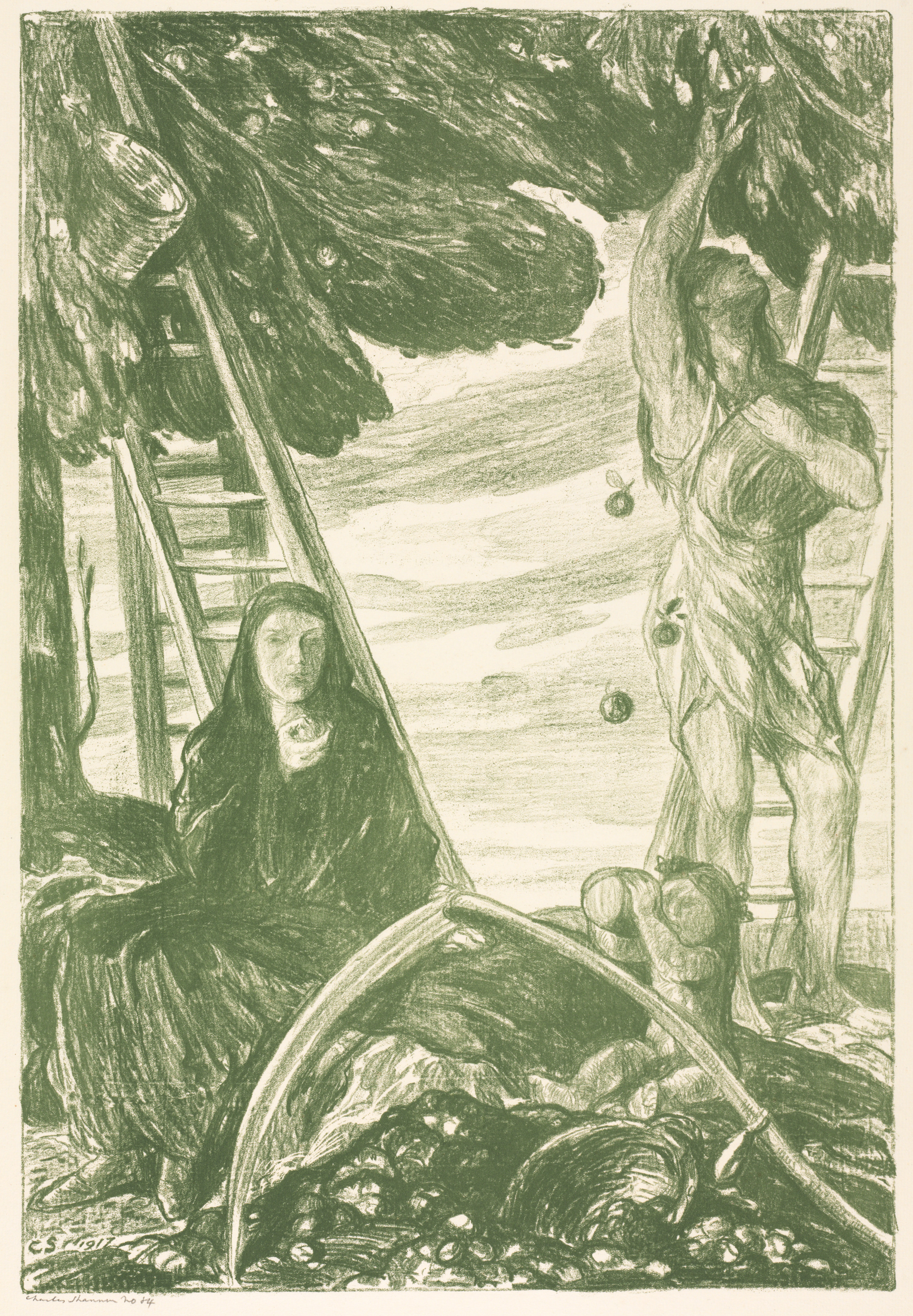 Green drawing of a man and a woman picking fruit. The woman sits on the ground to the left of a ladder, surrounded by a pile of fruit. She wears a long dark dress and has long hair. The man stands to the right of the ladder, reaching up to pick fruit from a tree. He wears a short tunic and has short hair. The background includes a tree, a ladder, and a pile of fruit on the ground. The artwork is titled "Autumn" and was created by Charles Hasslewood Shannon.