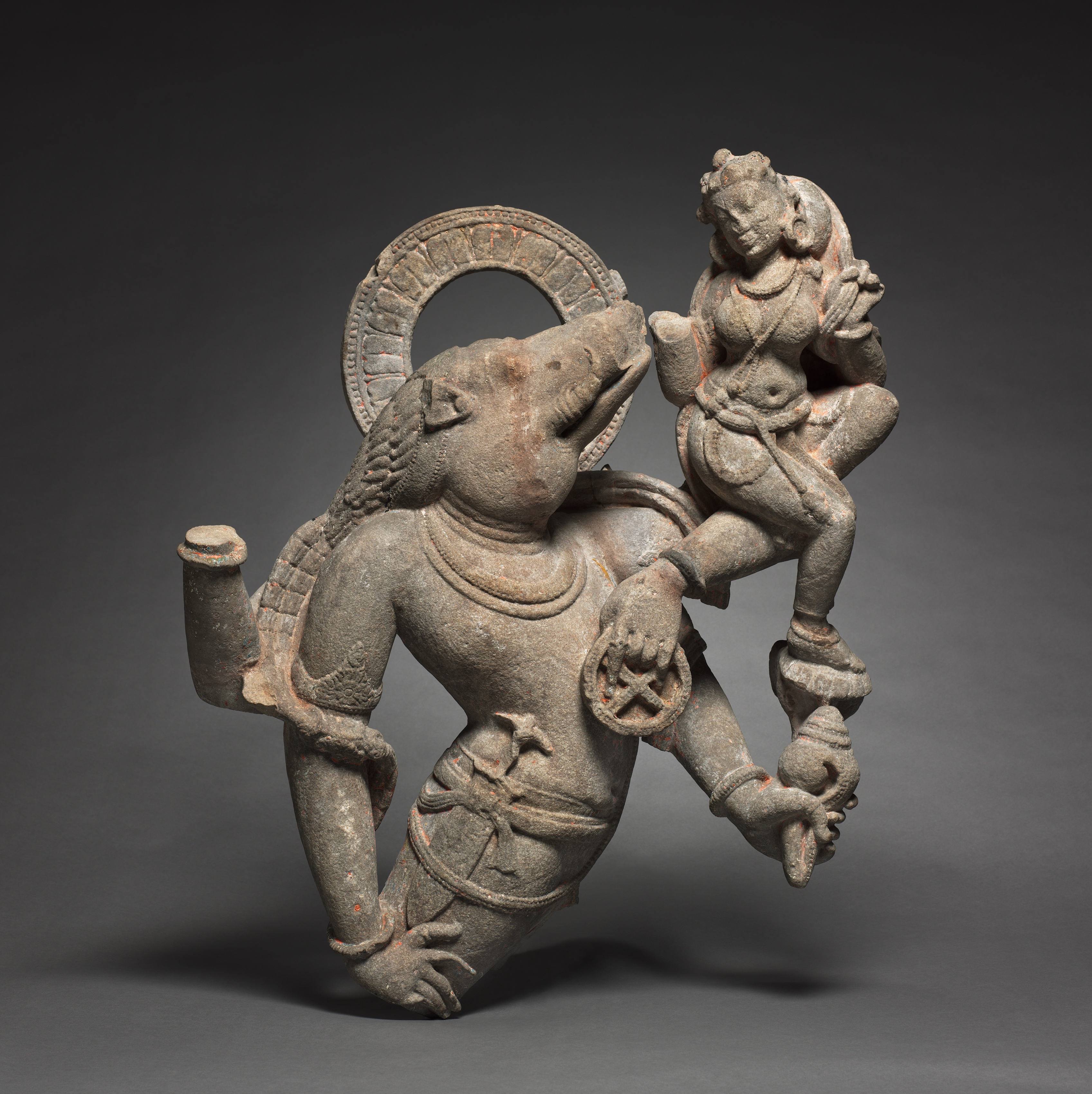 The sculpture depicts a boar and a woman. The boar has a long snout, large ears, and a curved tusk. It stands on its hind legs with one front leg bent at the elbow and the other extended downward. The boar has a decorative collar and a cloth wrapped around its waist. A circular object with decorative trim is on its back. The woman stands on the boar's front leg, with one foot on the boar's knee and the other on its hoof. She has long hair and wears jewelry including necklaces and bracelets. She has one arm around the boar's neck and holds a cloth in the other hand. The sculpture is gray with some reddish-brown areas. The background is dark gray. Varaha, Boar Incarnation of Vishnu.