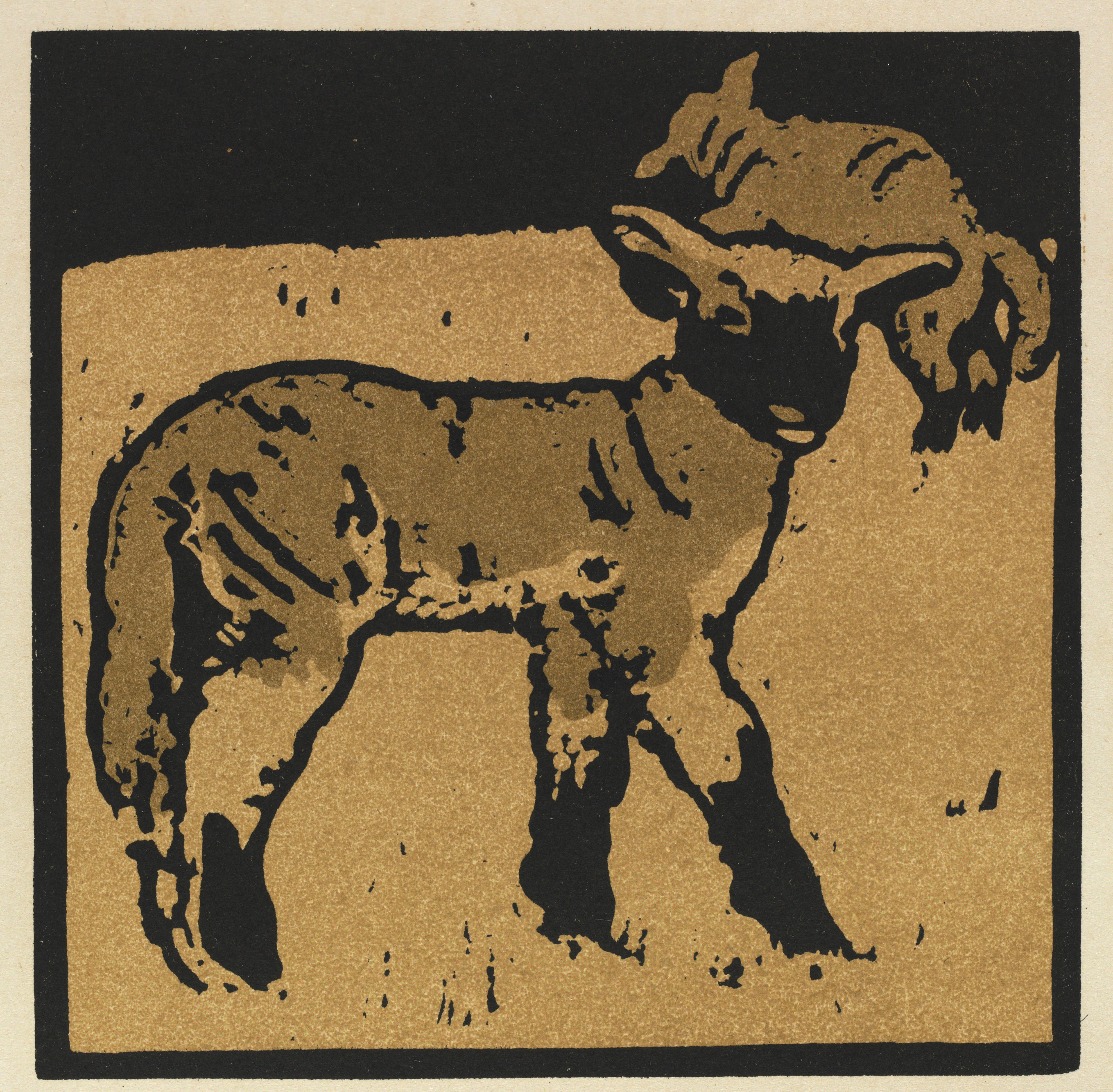 The image depicts a square illustration of a lamb. The lamb is centered in the square and faces to the right. The lamb has a thick body and short legs. The head is turned slightly towards the viewer. The image is rendered in a woodcut style with bold black lines and a sepia-toned brown fill. The background of the image is black at the top and brown at the bottom. The square image has a thin black border and is set against a beige background.