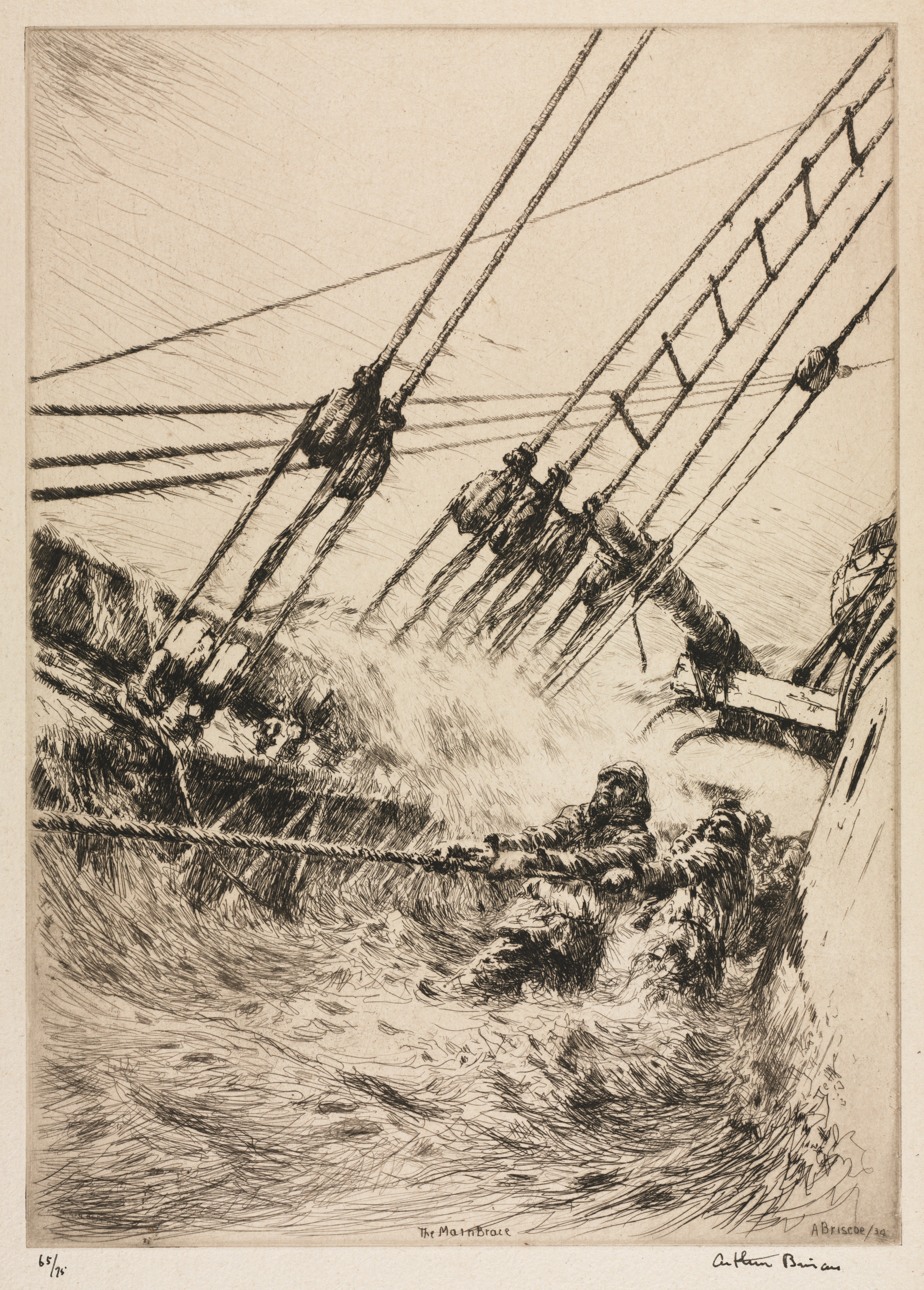 Black and white drawing of a ship on rough seas. The bow of the ship cuts through a wave crashing across the deck. The waves are depicted with heavy lines. A man lies on the deck. The ship's rigging and masts are visible. The title "The Main Brace" and the artist's signature are written at the bottom.