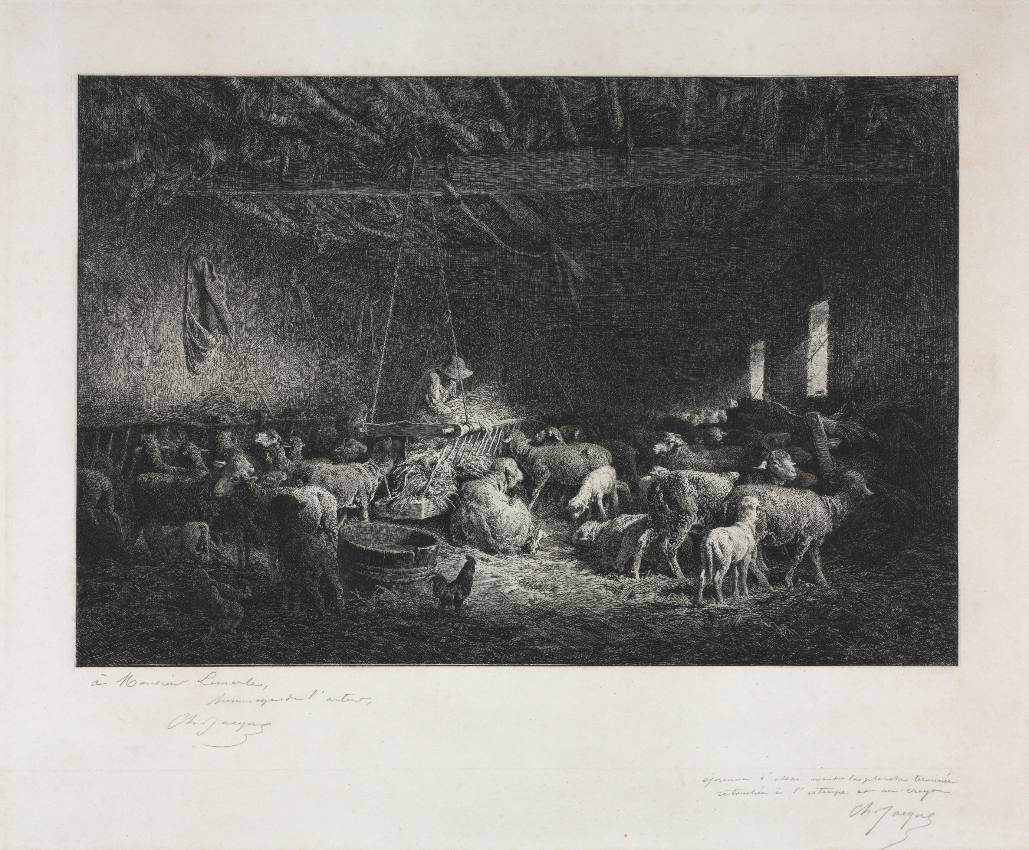 Black and white image of a crowded barn interior. A man wearing a hat is hanging from a beam on the ceiling, holding a pitchfork. A man in a hat on the left is sitting on a sheep. Many sheep are standing around, with a few chickens on the ground. The background shows a wall with a window on the right. Rough wooden beams are on the ceiling. The artwork is titled "Stable" by Charles-Émile Jacque.