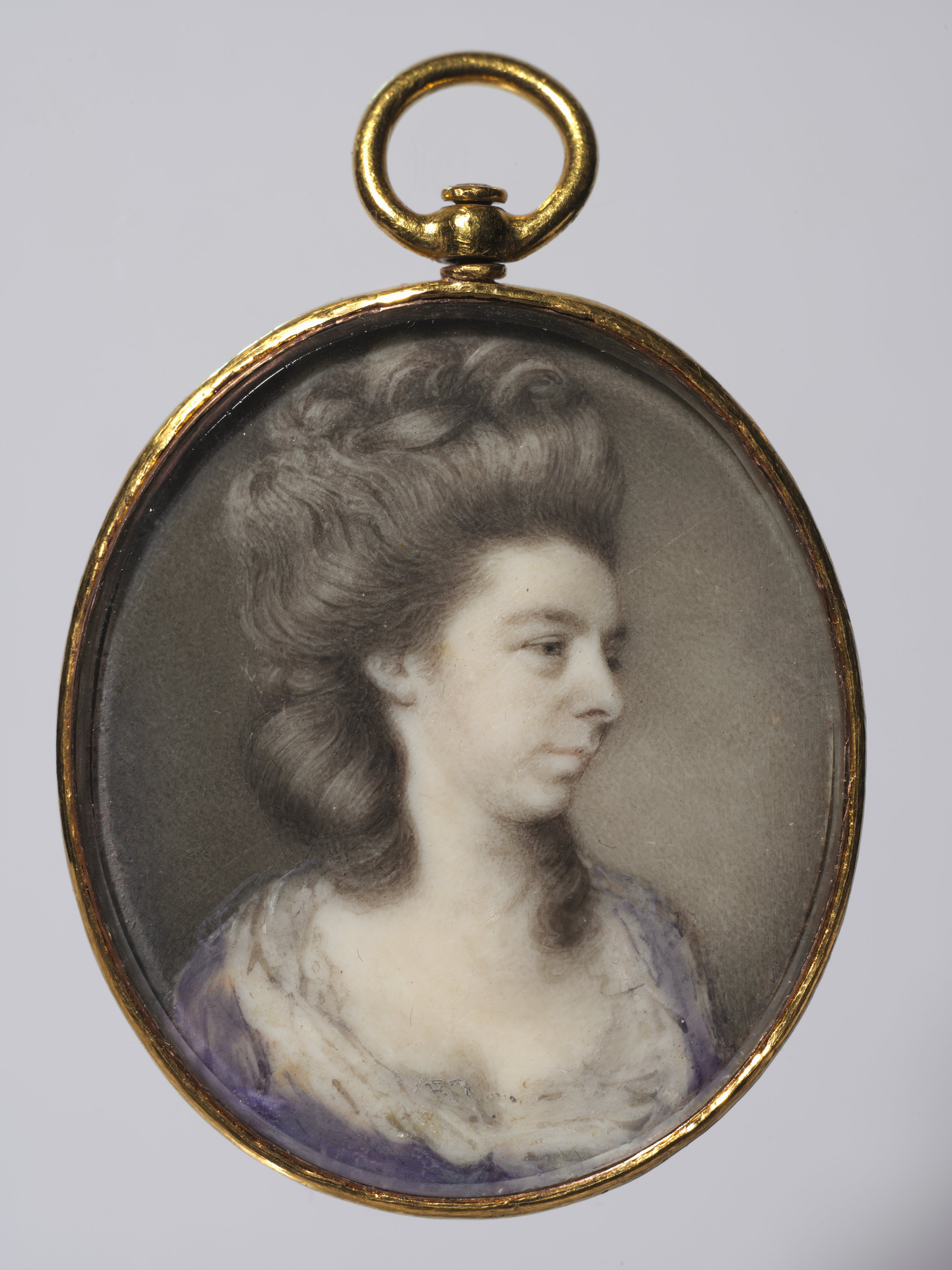 Oval-shaped miniature portrait of a woman in a gold frame with a loop at the top. The woman has fair skin and dark hair styled in an updo with curls. She wears a purple dress with a white lace collar. The background of the portrait is gray. The frame is gold with a textured edge. The portrait is set against a light grey background.