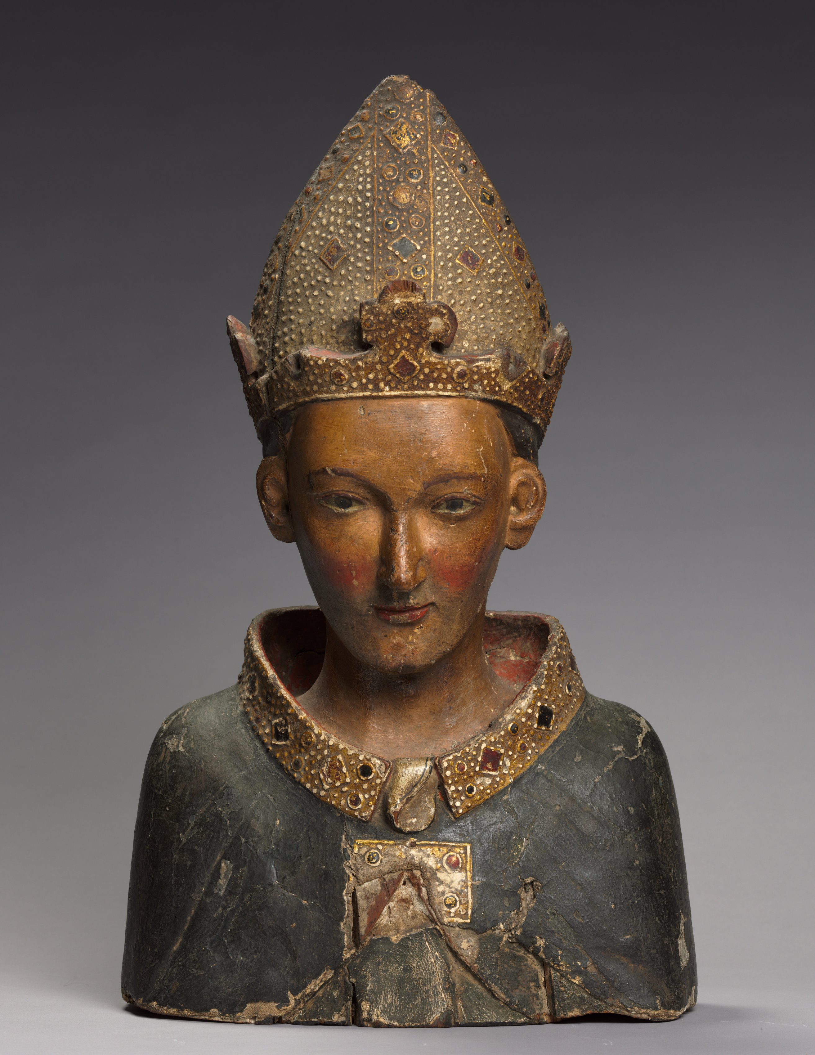Bust reliquary of St. Louis, Bishop of Toulouse by an unknown artist. The bust depicts a male figure with a neutral expression. He has a smooth face with rosy cheeks and a small nose. The figure wears a large mitre on his head, which is decorated with gold, jewels, and ornate designs. The mitre is shaped like a pointed roof. He also wears a black robe with a wide, gold-trimmed collar. A gold clasp with a jewel in the center secures the robe at the chest. The background of the image is gray, transitioning from dark at the top to light at the bottom.