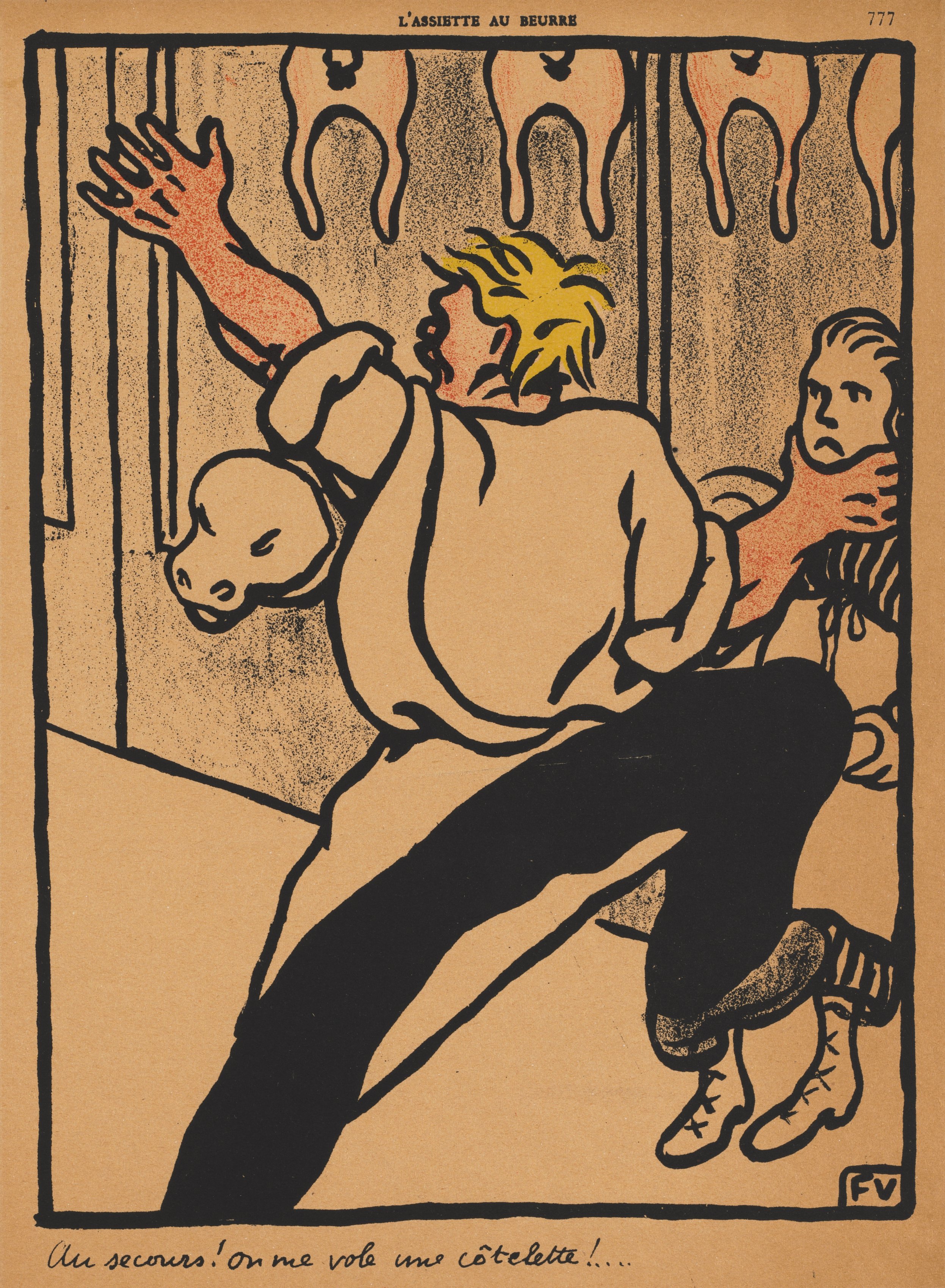 A man with blond hair wearing a white shirt and black pants reaches out with one hand towards a butcher's display case while turning to look behind him. He has one leg bent. A cutlet hangs in the display case with four pieces of meat above it. A second man with slicked back hair wearing a striped shirt and shoes looks on from the right. The background includes a tan floor and tan walls. Small writing in cursive at the bottom reads 'Au secours on me vole une cotelette'. The artwork is bordered with a black line. Text at top centre reads 'L'Assiette au Beurre'.