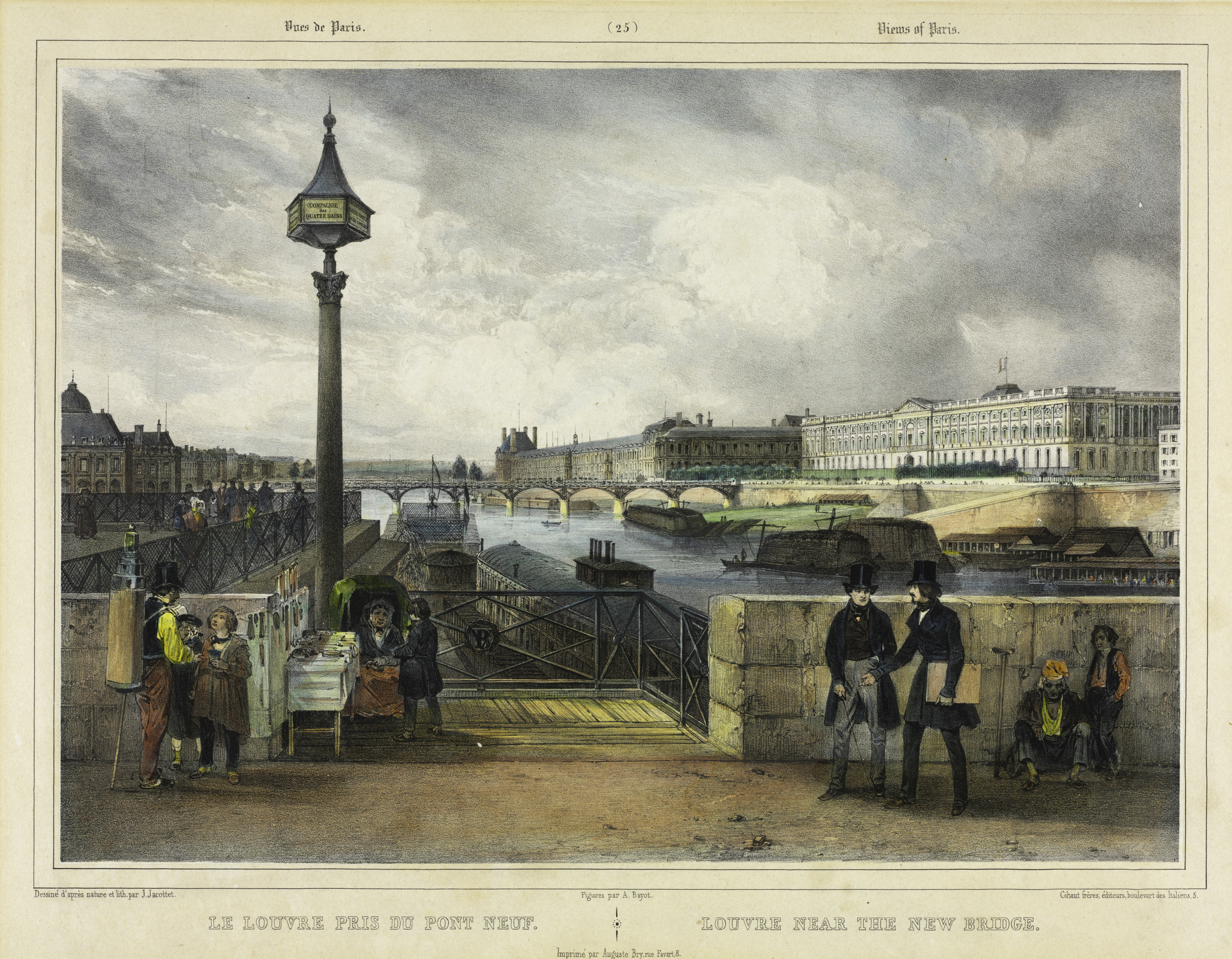 An old illustration of a city scene. A large stone wall runs along the bottom edge. Two men in top hats stand on the right side of the wall. A boy sits on the wall. A man and a girl stand on the left side. A tall post with a lantern on top and a sign reading 'Commissariat Quai Voltaire' stands next to a ramp with a metal railing that leads down to a body of water. A bridge spans the water in the background. Several people are on or near the bridge. Large buildings line the far side of the water. The sky is cloudy. The image is titled 'The Louvre near the New Bridge by Julien Louis Jacottet'.