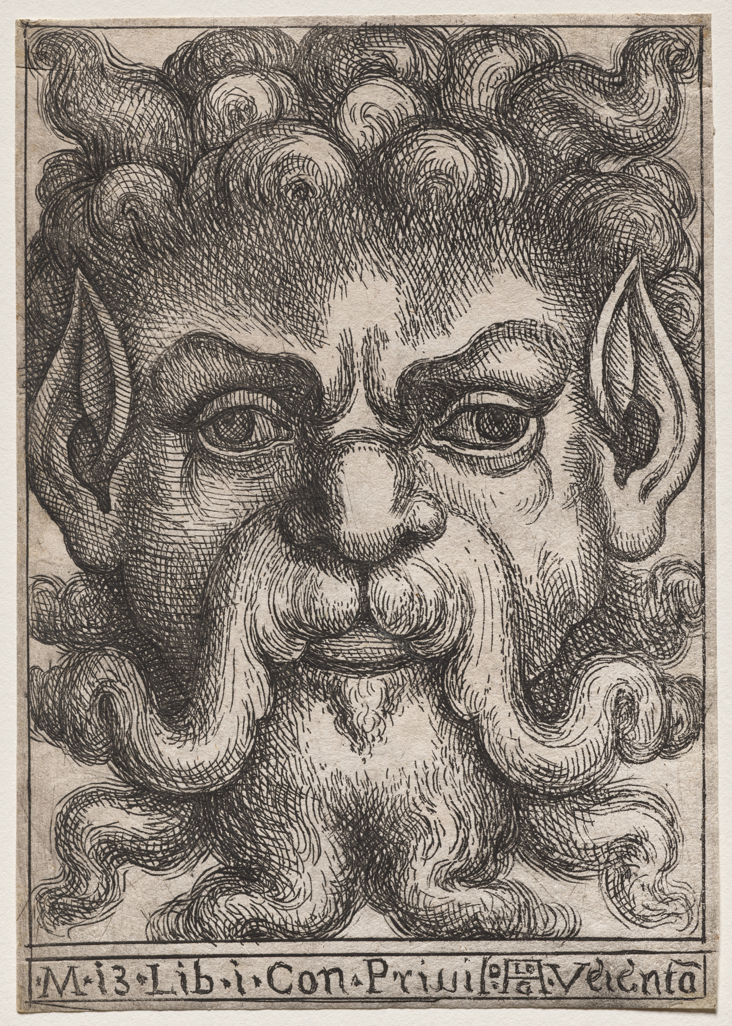 Black and white drawing of a grotesque face. The face has curly hair and a beard. Pointed ears protrude from the sides of the head. The face is looking straight ahead with a frown. A block of text appears at the bottom. The text reads "M i3 Lib i Con Privilegio Veneta".