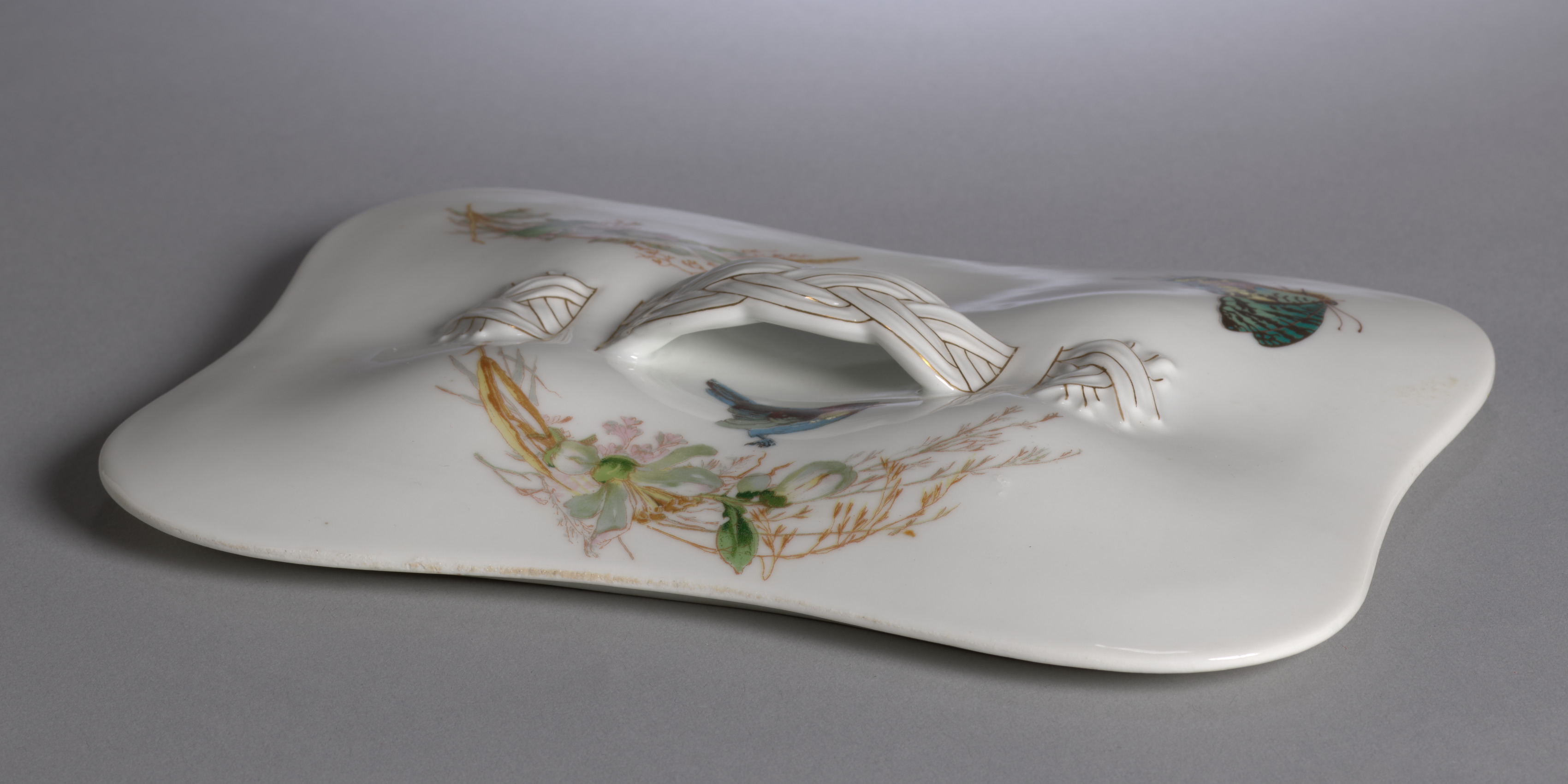 Cover for a Vegetable Bowl by Herend. White ceramic cover with a wavy edge and two handles on top. The cover has a painted design featuring birds and plants in shades of green, blue, pink, and brown. The handles are white with a gold line design. The background of the image is gray.