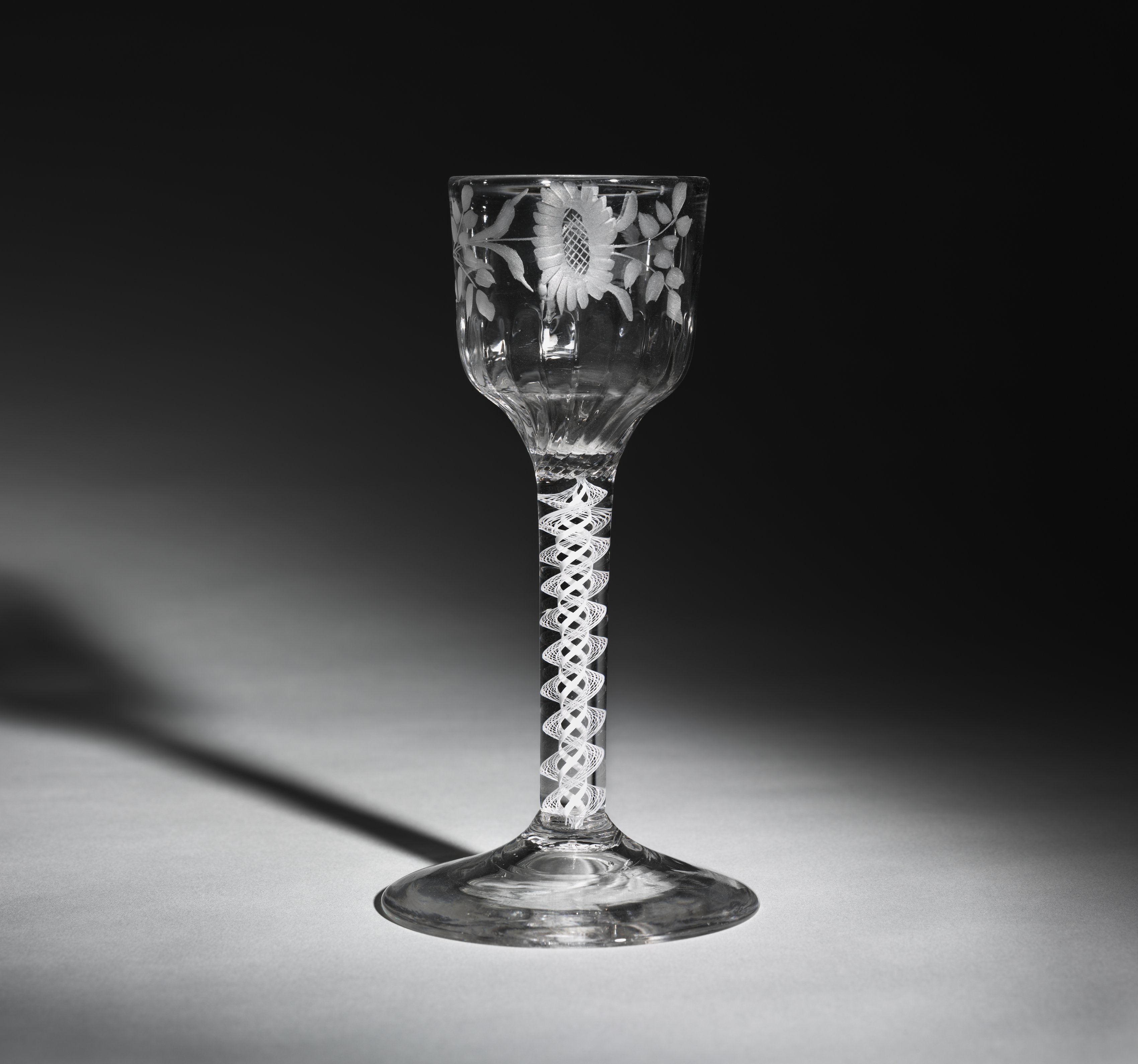 The goblet by David Leach features a clear glass body with a wide, short bowl adorned with etched white floral patterns. The bowl has a rounded shape with a flat rim and a slight lip, decorated with sunflowers and leaves. The stem is long and slender with a spiral lattice design. The base is wide and flat. The background is dark with a gradient light source coming from the bottom left. The goblet casts a shadow to the left.
