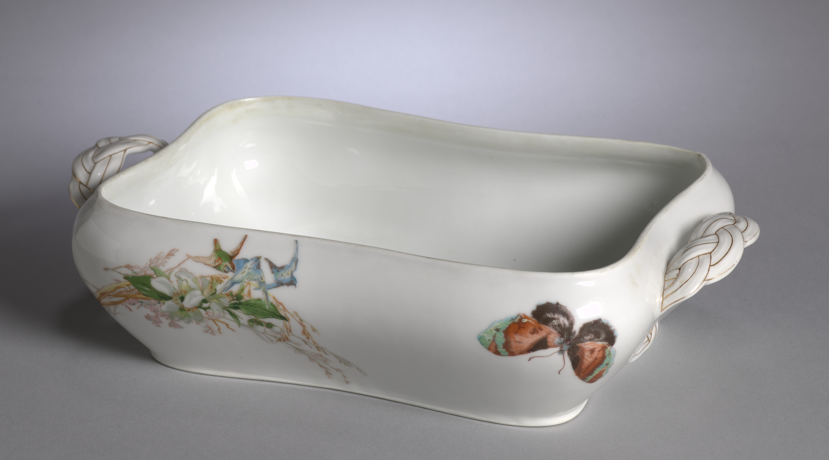 The image shows a white porcelain vegetable bowl. The bowl's body is oblong with wavy edges; the handles on each side are braided and made of the same white porcelain. The bowl features a colorful design on its exterior; on one side are two butterflies with brown wings and green edges, and on the other side are blue and green birds perched on a tree branch. The bowl is on a plain gray background. The Vegetable Bowl, a ceramic piece, was created by artist Ruth Duckworth.