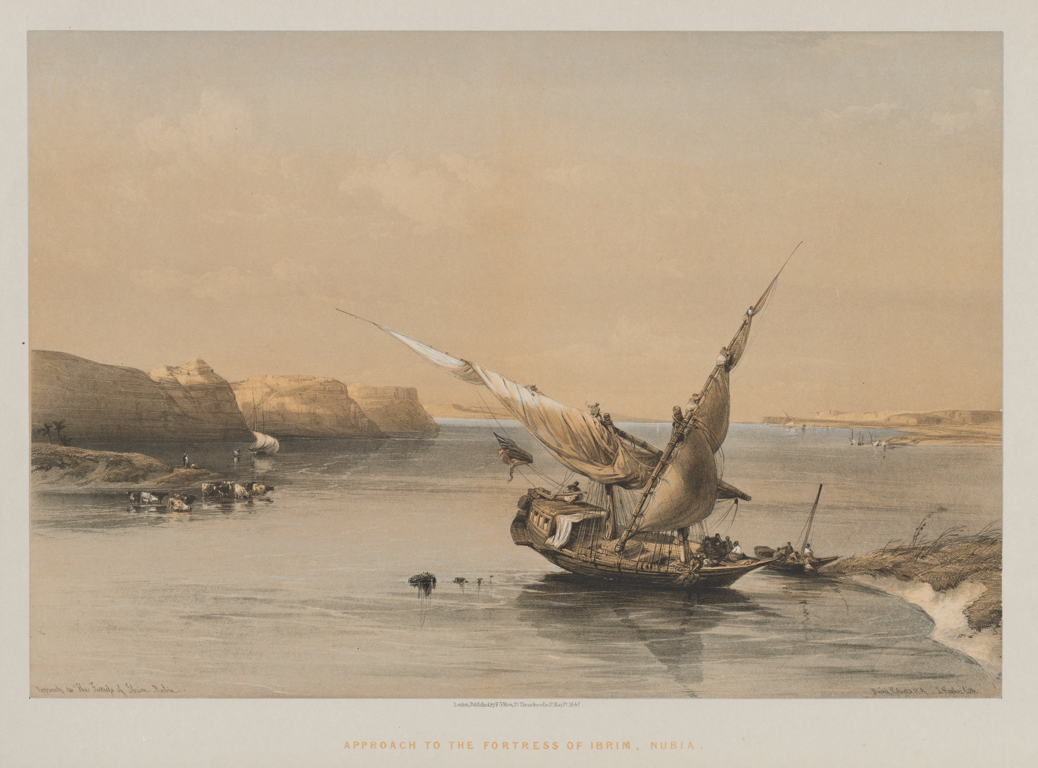 Large body of water with a ship in the foreground and cliffs in the background. The ship has two large sails and multiple people on board. A smaller boat with people is near the larger ship. On the left side of the water, a group of cows are gathered. In the distance, there are more ships and a cliffside. The sky is cloudy and light brown. The cliffs in the background are layered and brown. The water is calm and reflects the ships. A caption reads "Approach to the Fortress of Ibrim, Nubia".