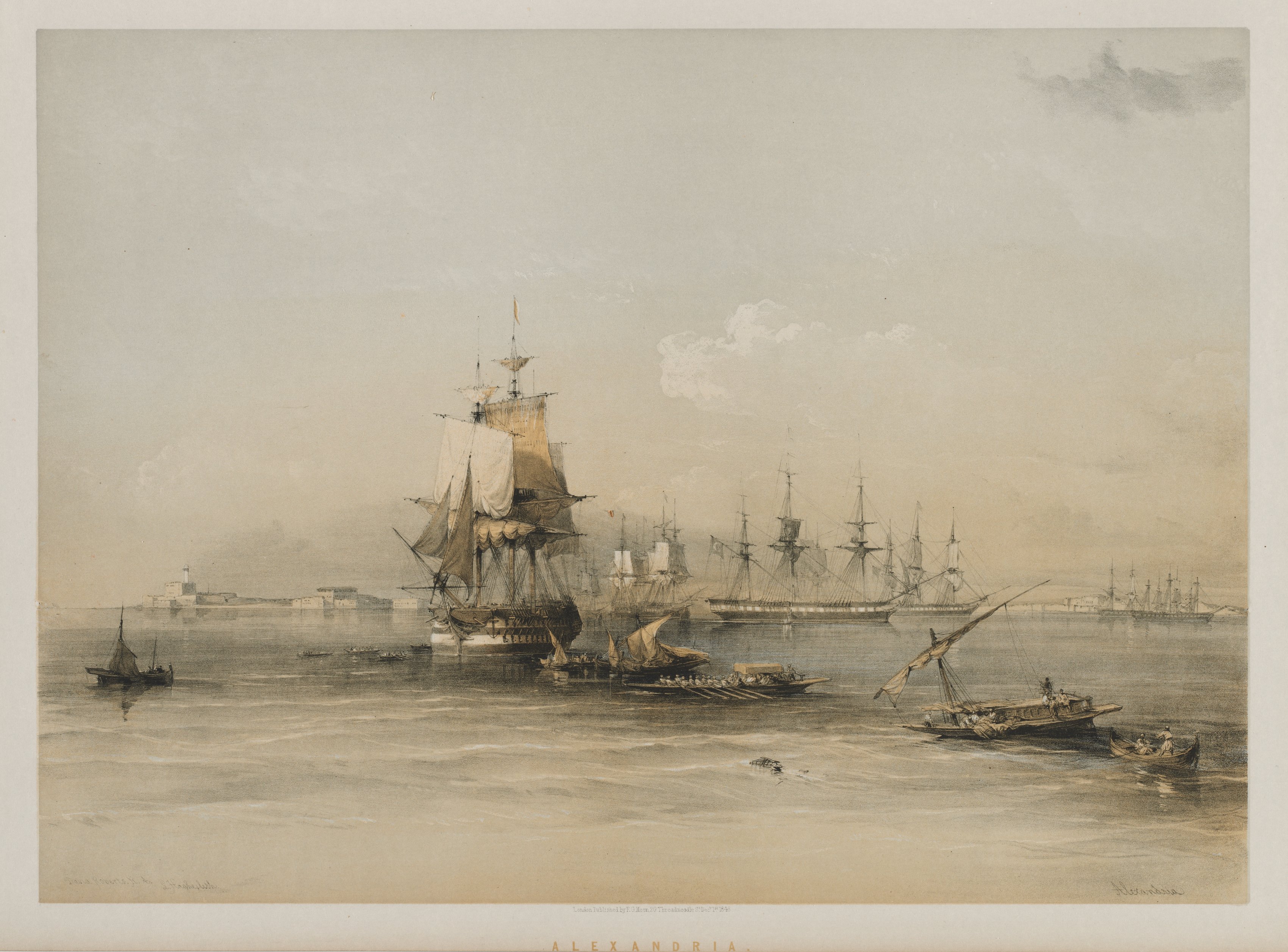 The image depicts a harbor scene with multiple ships and boats. A large ship with three masts and white sails is in the center, surrounded by several smaller boats and other larger ships. The water is calm, reflecting the vessels. In the background, there are buildings along the shore. The sky is light blue with some clouds. The image is rendered in sepia tones. At the bottom, the word "Alexandria" is written.