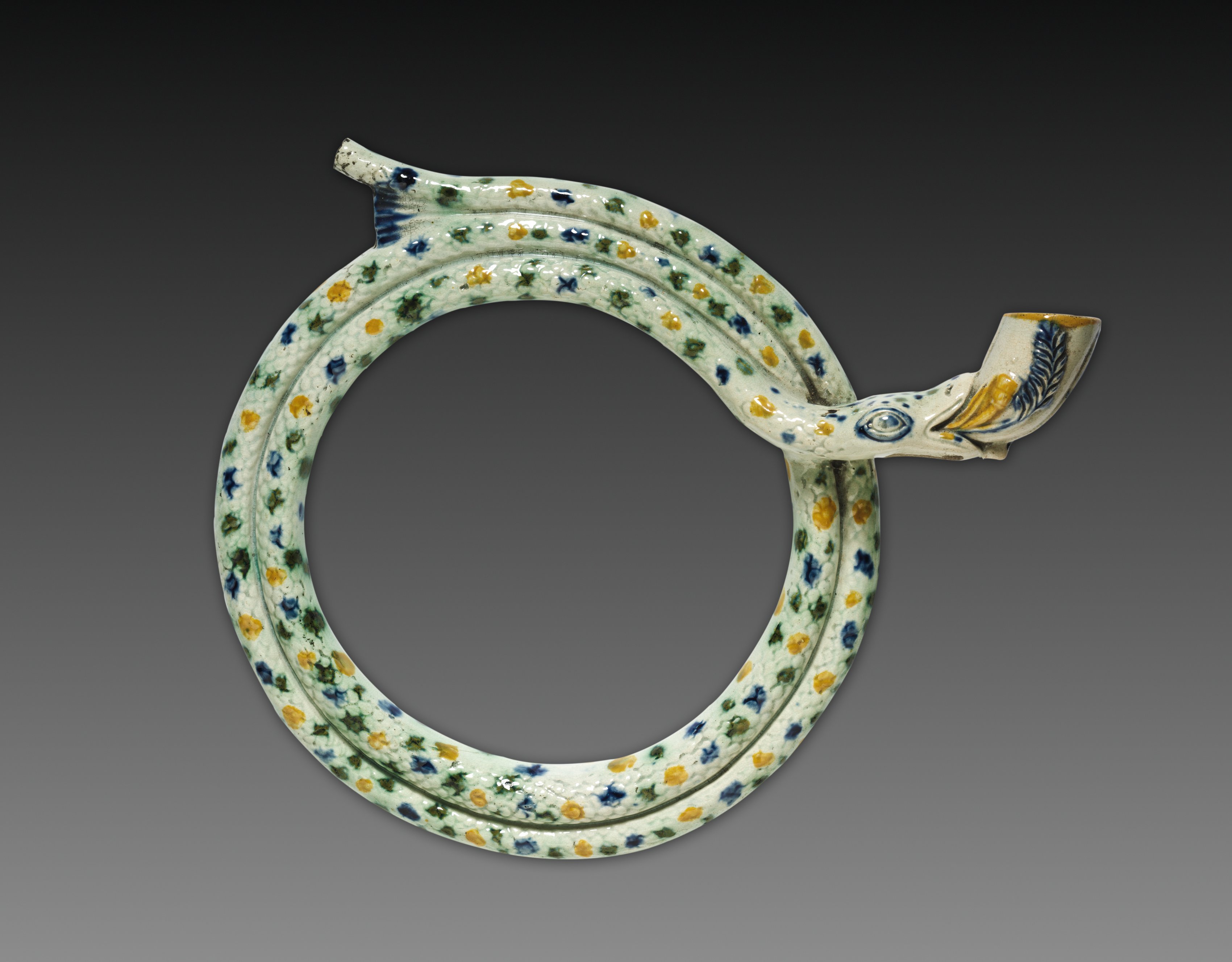 The object is a ceramic pipe shaped like a coiled snake. The pipe is white with blue, yellow, and green floral designs. It has a glossy finish. The snake's head is on the right side, with one eye visible and a blue and yellow design on its face. The pipe's body is coiled into a circle, with the tail end on the top left. The background is a gradient from dark gray to light gray.