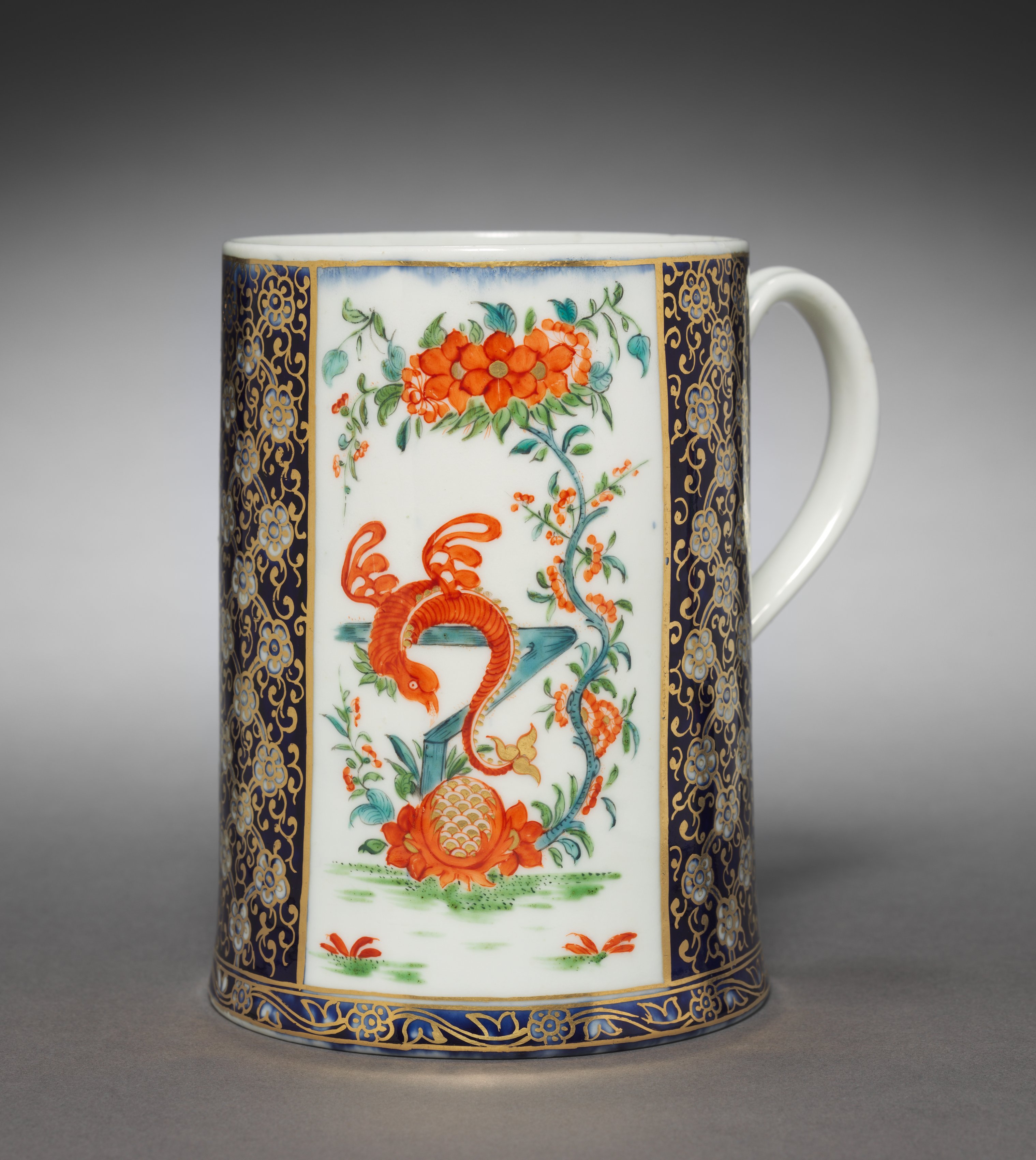 White porcelain mug with handle on right side. Vertical rectangular panel on front with gold border. Panel contains orange koi fish swimming amidst orange flowers, green leaves, and green and orange sea foliage on white background. Two vertical borders on either side of panel, with navy blue background and gold scrolling floral design. Gold, blue, and white scrolling floral design on bottom border. Gradient grey background. "Cann" by Chelsea Porcelain Factory.