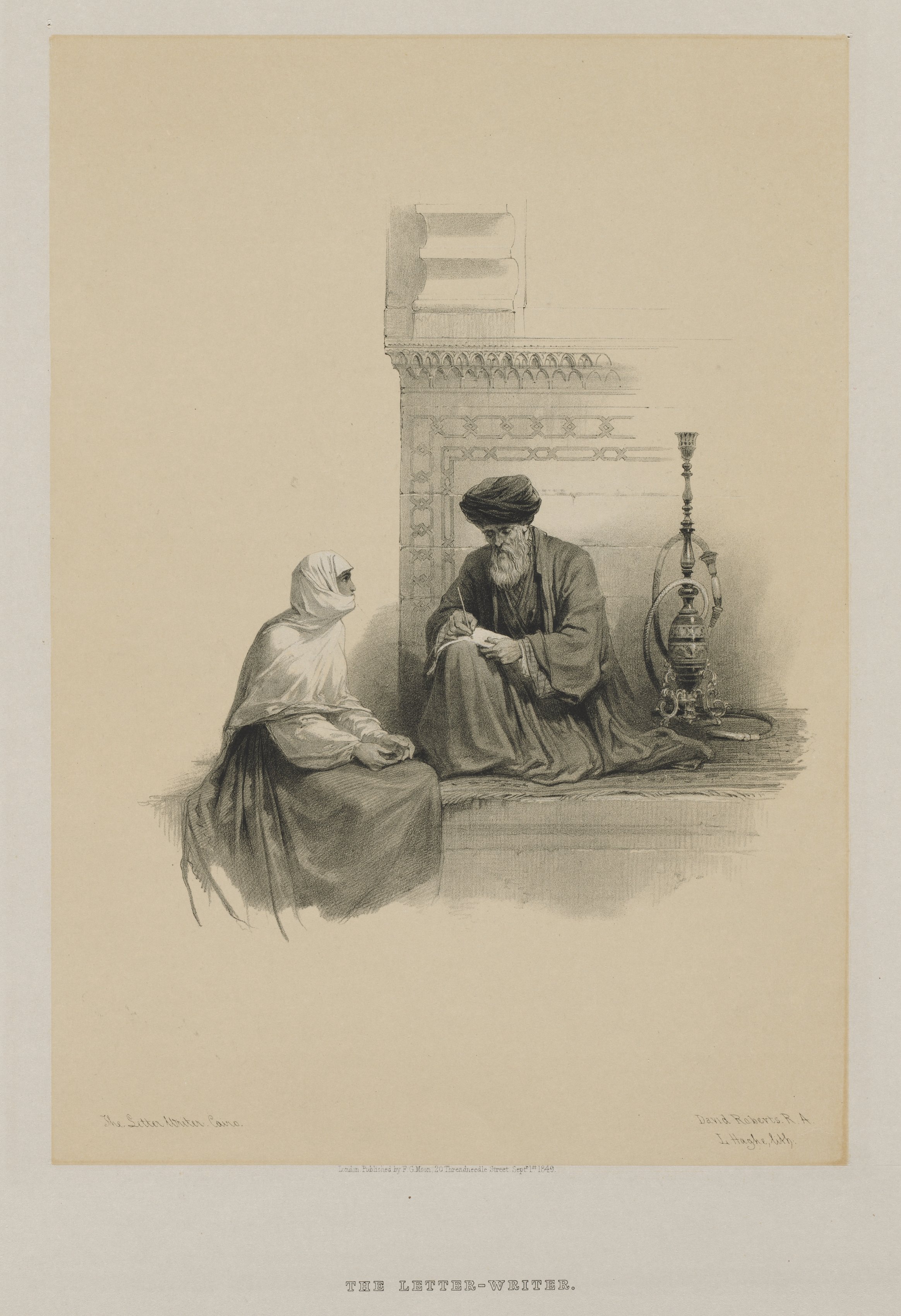 The image shows a black and white drawing of two people sitting on the floor. The man on the right wears a turban and robes, and sits cross-legged. He has a white beard and holds a quill pen. The woman on the left wears a headscarf and long dress. She sits with her hands folded. A hookah sits to the man's right. Behind them is a patterned wall with a ledge. The image's title, "THE LETTER-WRITER," appears below. The background of the drawing is beige.