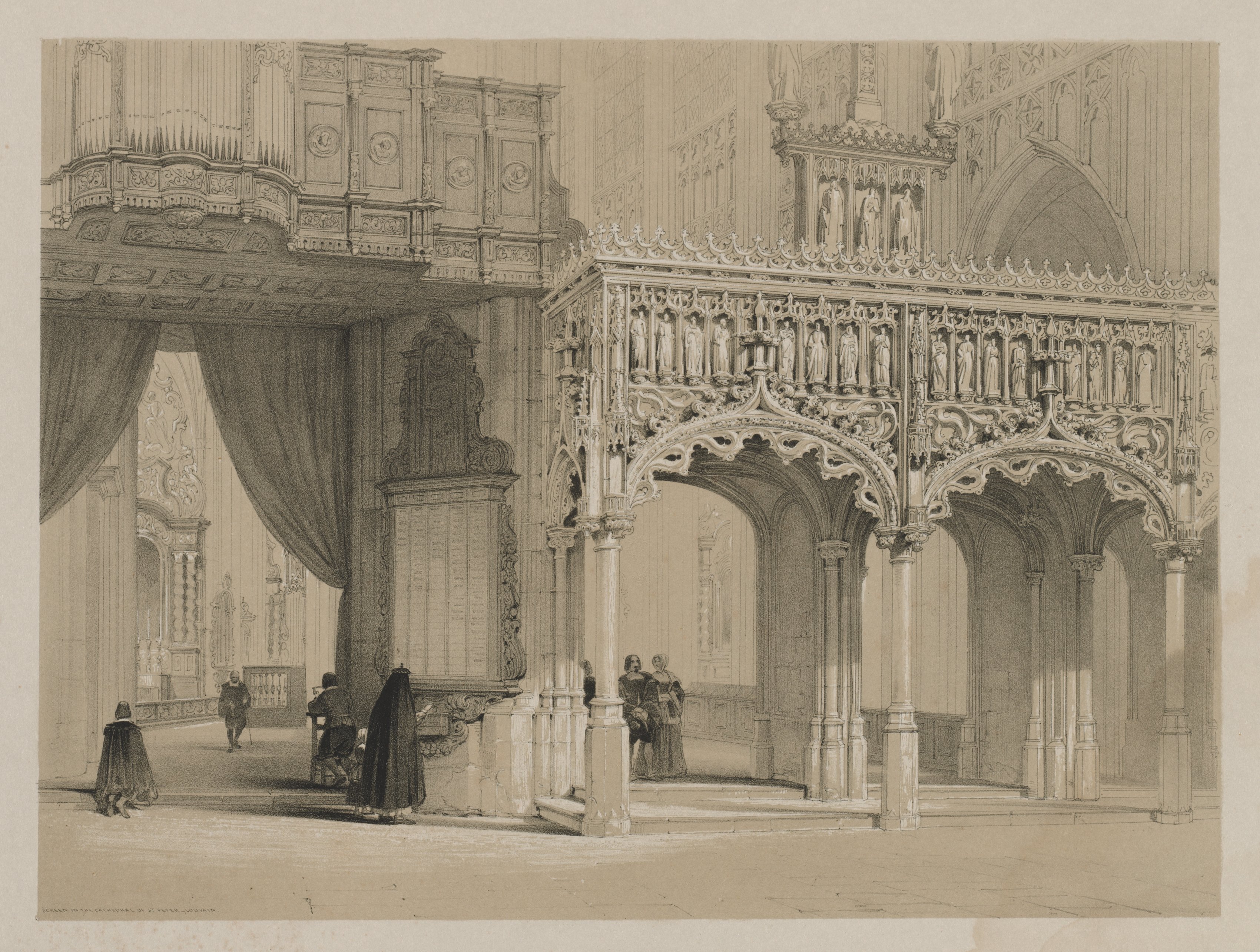Sepia-toned drawing of interior of a church. Ornate screen with three pointed arches fills right half. Screen supported by four columns. Row of statues along top. Left half shows elevated organ with large curtain on left. People dressed in 19th-century clothing standing or walking. Floor made of stone or tile. Walls made of stone with decorative carvings.