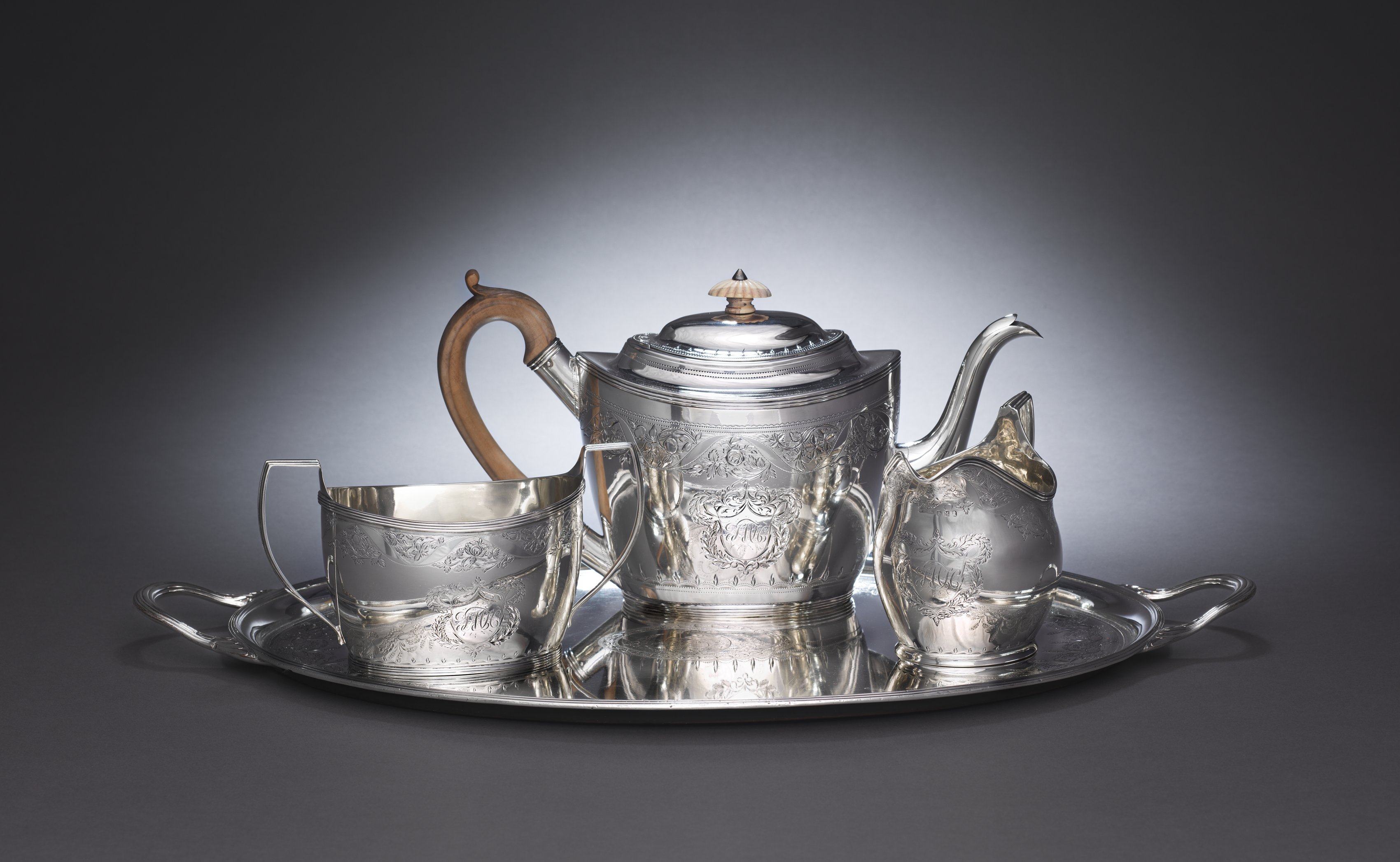 Silver tea service on a matching tray. The service includes a teapot with a wooden handle and a small decorative finial on the lid, a creamer with a curved spout and gold trim on the lip, and a cup with a single handle. All pieces have engraved floral designs. The teapot and creamer have a single handle. The tray has two handles and an engraved design around the edge. The background is dark gray with a lighter gray vignette behind the service. The tray and service are by Anne Bateman.