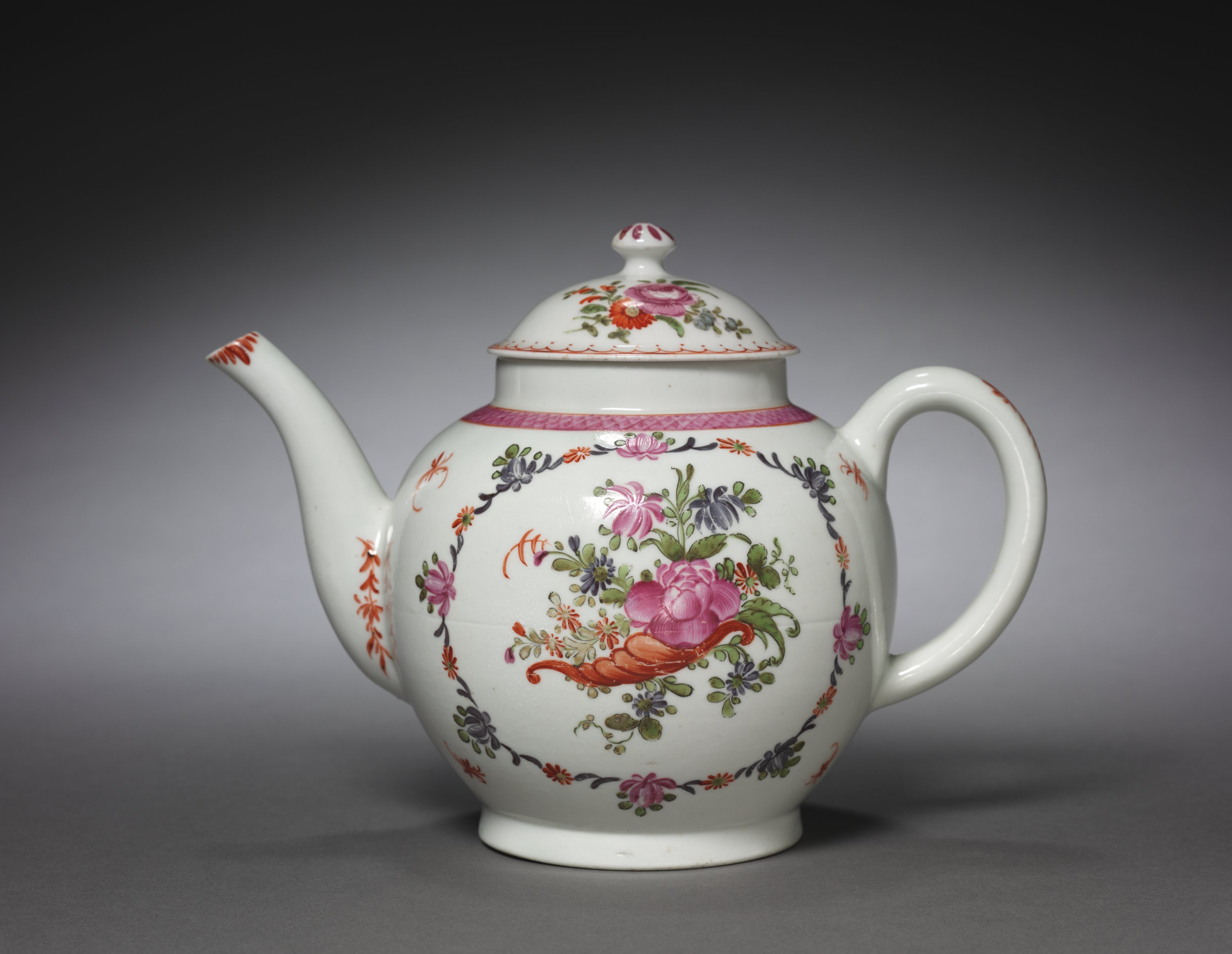 White teapot with a floral design. Pink, orange, green, and purple flowers and foliage painted on body. Red trim on lid and spout. Small finial on top of lid. Pink band around neck. Handle on right side. Spout on left side. Base is flat. Background is gray gradient.