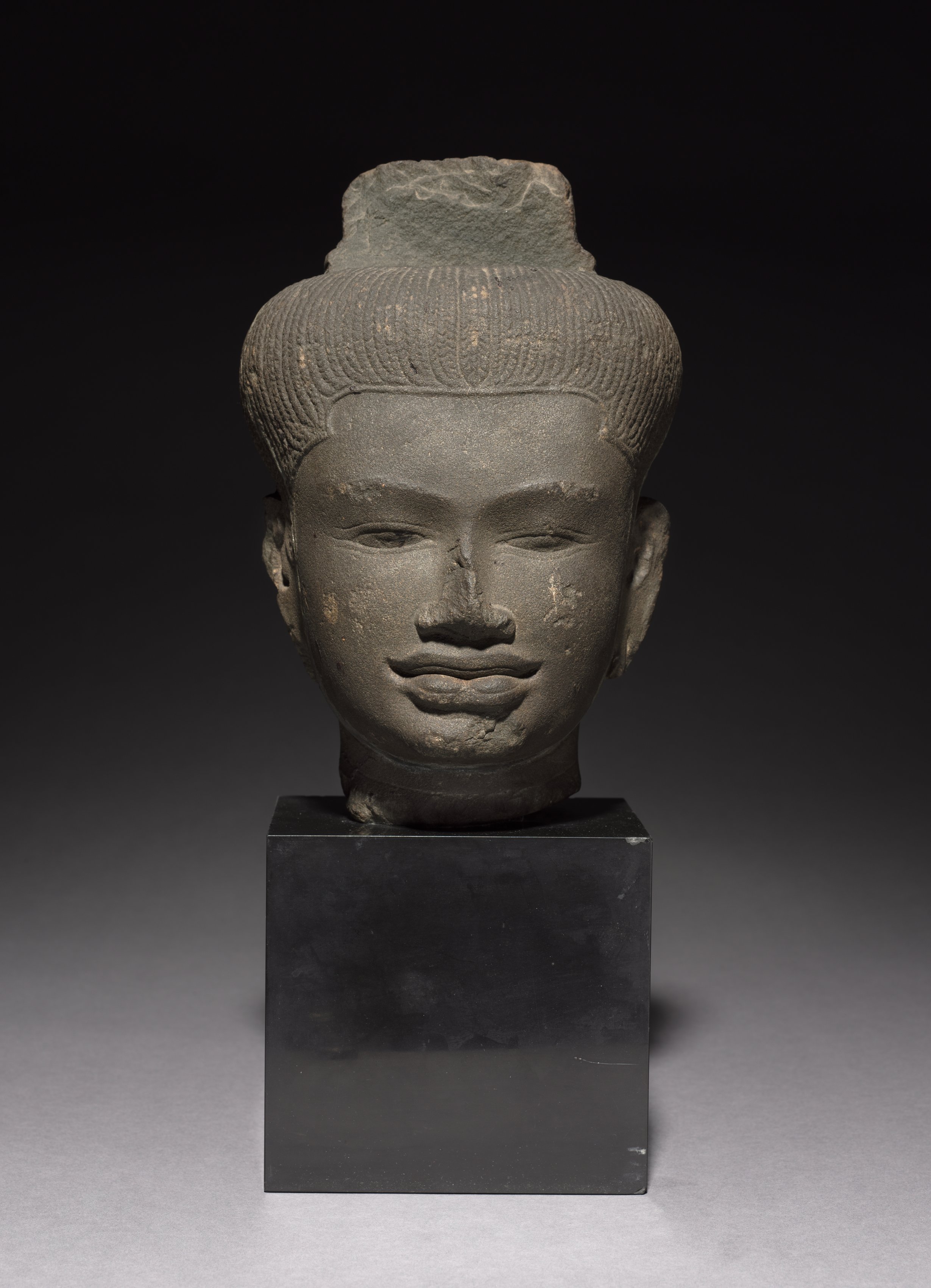The sculpture depicts a human head with a serene expression. The head is made of dark gray stone and features a hairstyle that is pulled back and adorned with a decorative design. The face has a calm and meditative appearance, with eyes that are cast downward. The lips are thin and pressed together. The sculpture sits atop a black rectangular base. The background is dark at the top and gradually lightens toward the bottom. Title: Head of a Follower of Shiva.