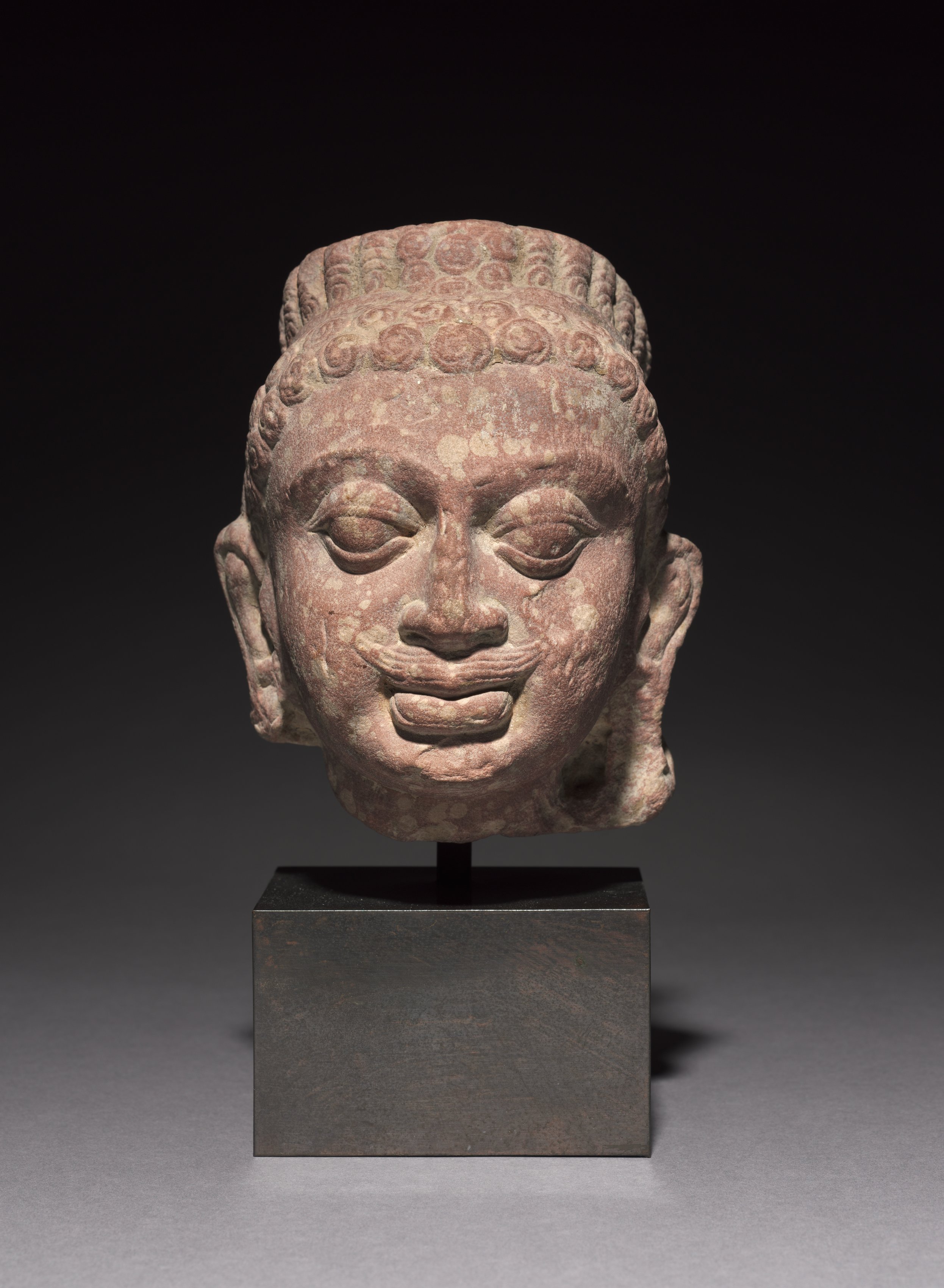 The head of Kubera is a sculpture of a human head with a serene facial expression. The head is made of reddish-brown stone and sits on a dark gray rectangular base. The face has a calm and peaceful appearance with eyes that are closed or half-closed, and the mouth is slightly smiling. The head is adorned with a decorative topknot on the crown, which consists of rows of small curls or snail shell-like patterns. The ears are long and protruding. The background of the image is dark, transitioning from black at the top to gray at the bottom. The overall appearance of the sculpture suggests it is an ancient artifact.