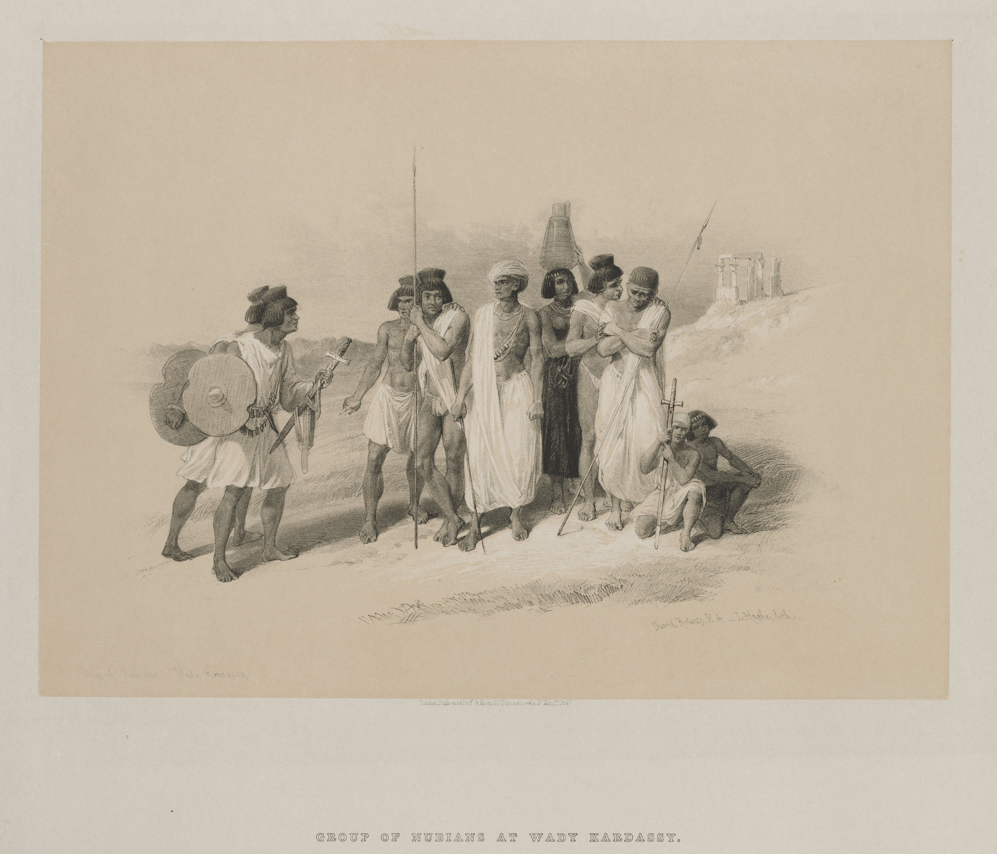 Black and white drawing on beige background. A group of 8 people, all with dark hair and wearing white cloth wrapped around their bodies. Four men on the left side of the group are barefoot and most have head wraps. Three of the men are holding spears. The man on the far left is holding a large round shield. A seated man on the right is holding a cross-shaped staff. Behind the group, there are ancient stone ruins on a hill.