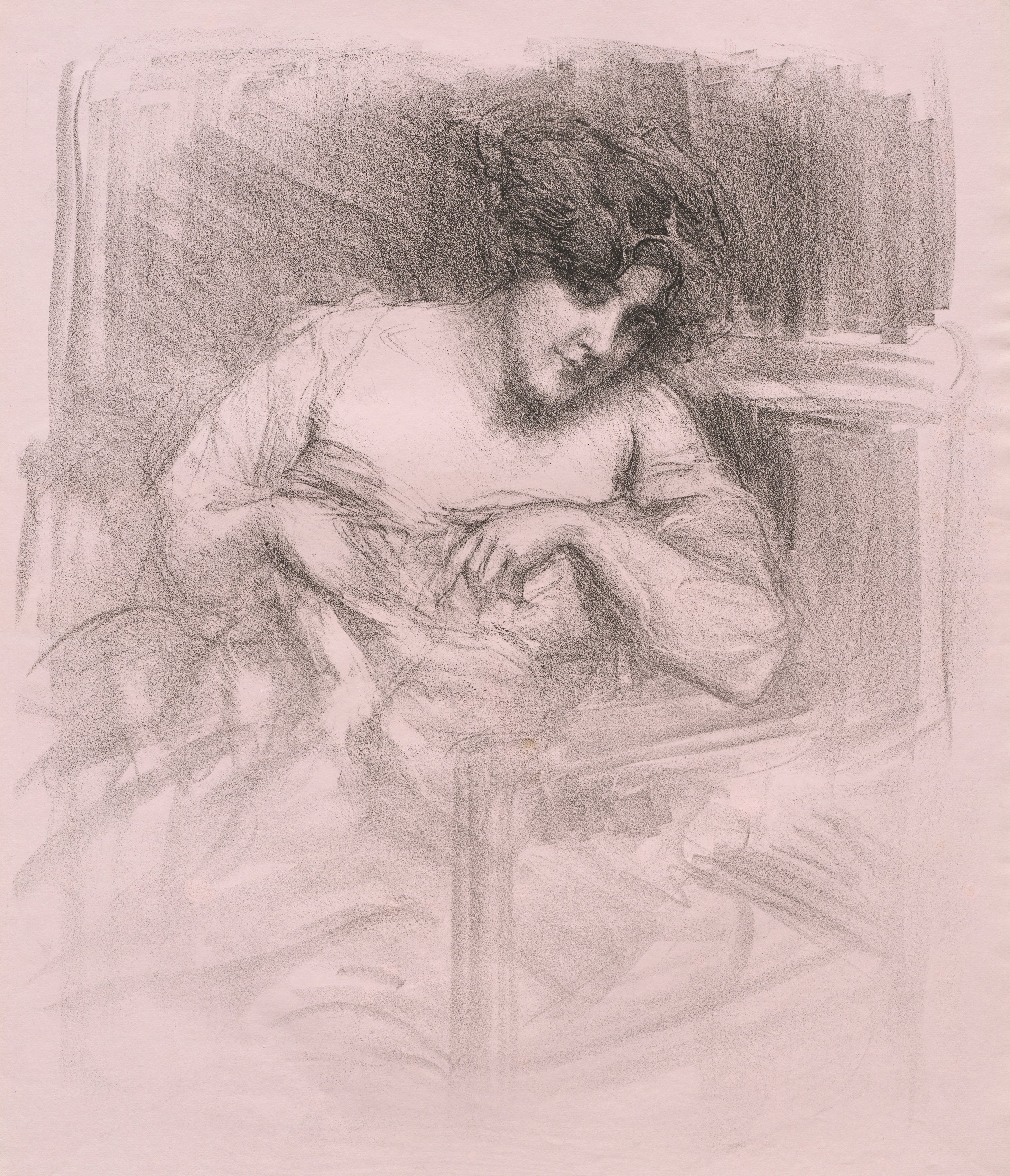 The painting depicts a woman with dark hair sitting in a chair. The woman is wearing a long-sleeved top. Her elbows are resting on a table in front of her, and her hands are clasped together. Her head is tilted down and to the right. The background shows a wall with a darker area behind the woman's head. The overall color palette of the painting is monochromatic, with shades of gray. The style of the painting appears to be impressionist or expressionist. The title of the painting is "Flirt" and it is by Albert de Belleroche.