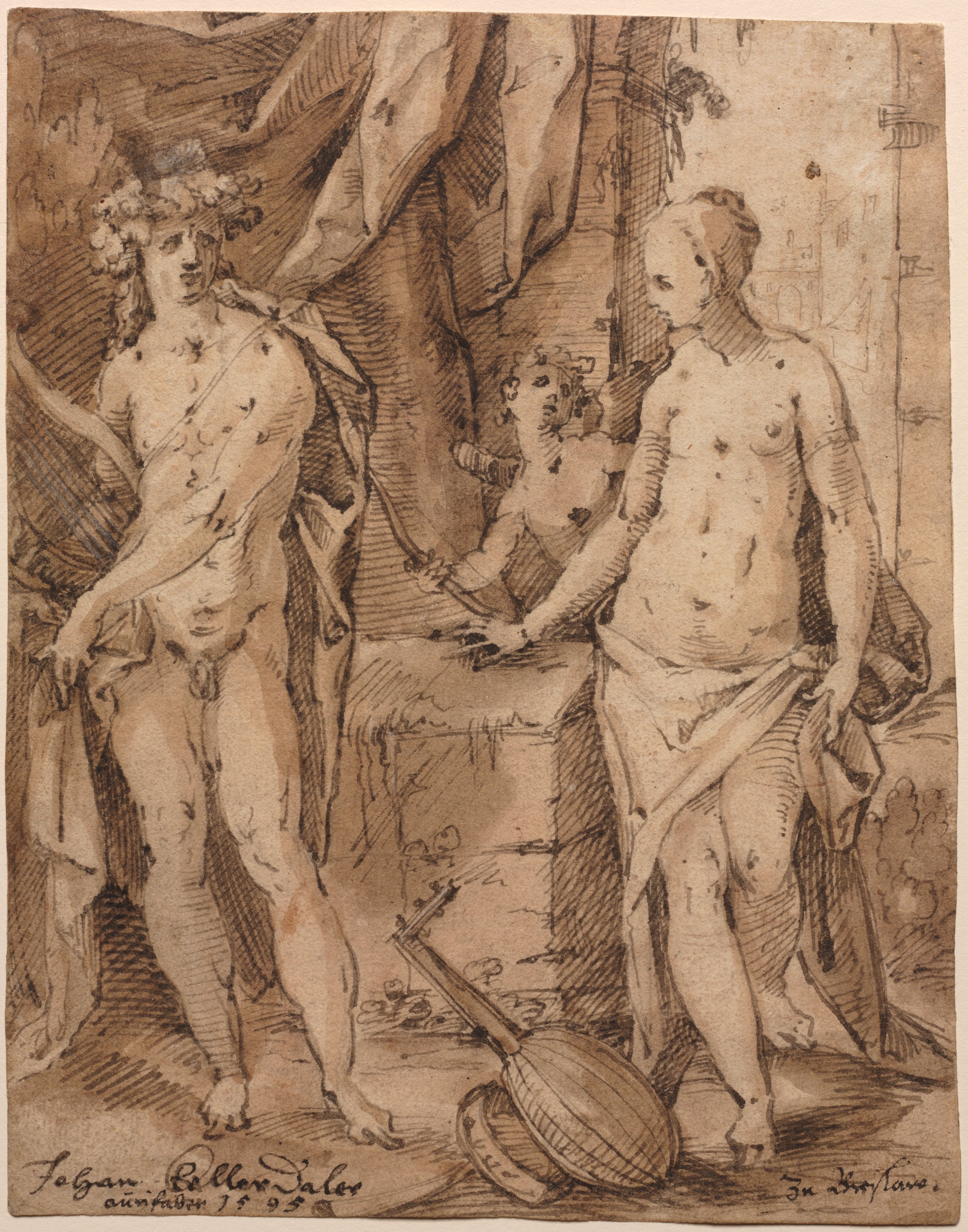 The image depicts a drawing of three figures. A man on the left wears a wreath on his head and holds a cloth in his right hand. He appears to be naked with curly hair. In the background, a young boy sits on a stone block holding an object. On the right, a woman faces the left; she appears to be naked, holding a cloth in both hands. A musical instrument rests on the ground in front of her. The background includes draped fabric and other objects.