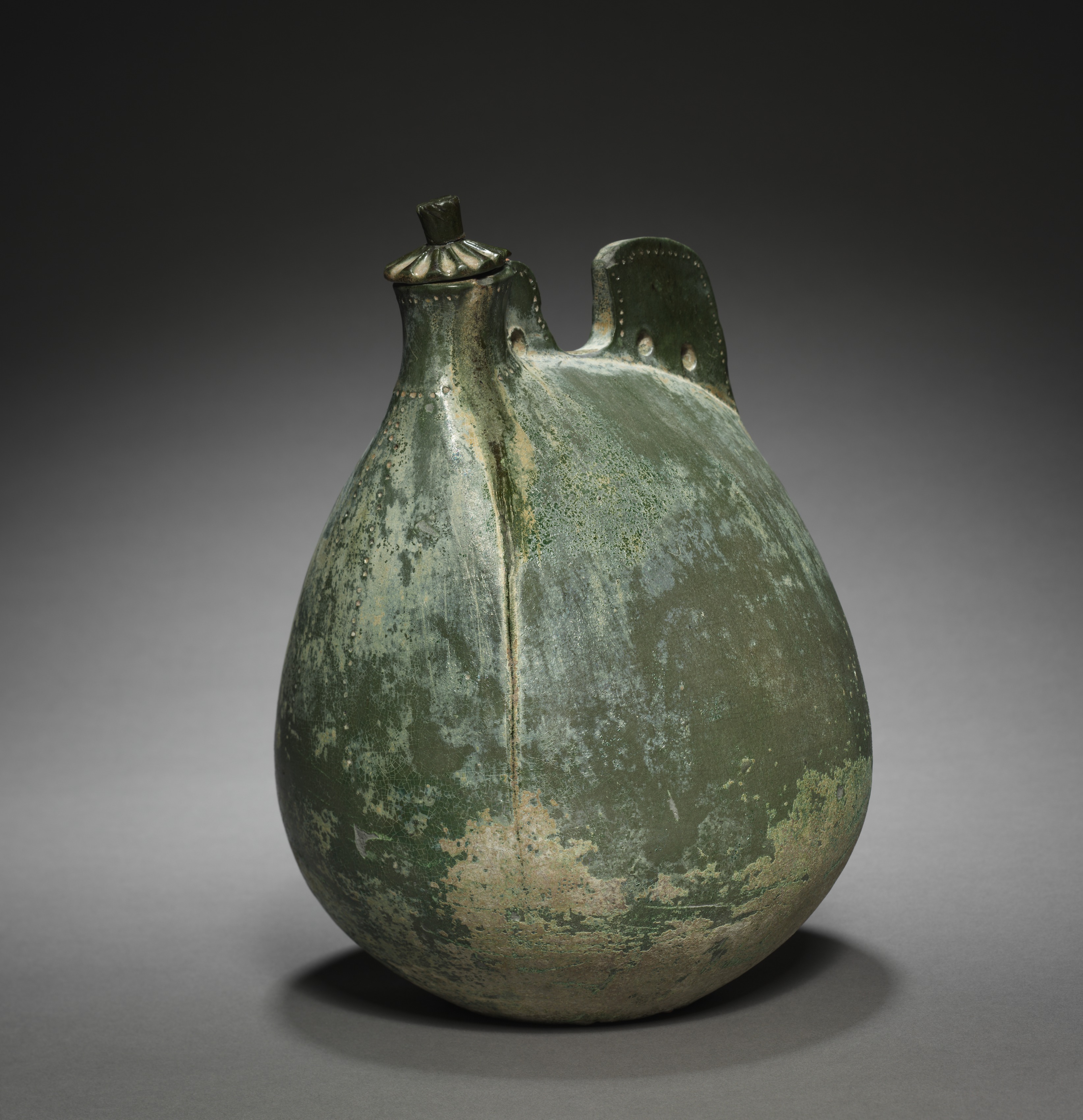 The object is a bulbous flask shaped like a leather bag. The flask is green with a darker green lid on one end. The flask has a handle on the top right side. The flask appears to be made of ceramic or clay. The surface has a mottled appearance with light and dark green and beige areas. The flask has a small knob on top of the lid. The background is dark gray and light grey gradient. The flask casts a shadow on the surface below. The flask is labeled as "Leather Bag-Shaped Flask with Cover" and is by an unidentified artist.