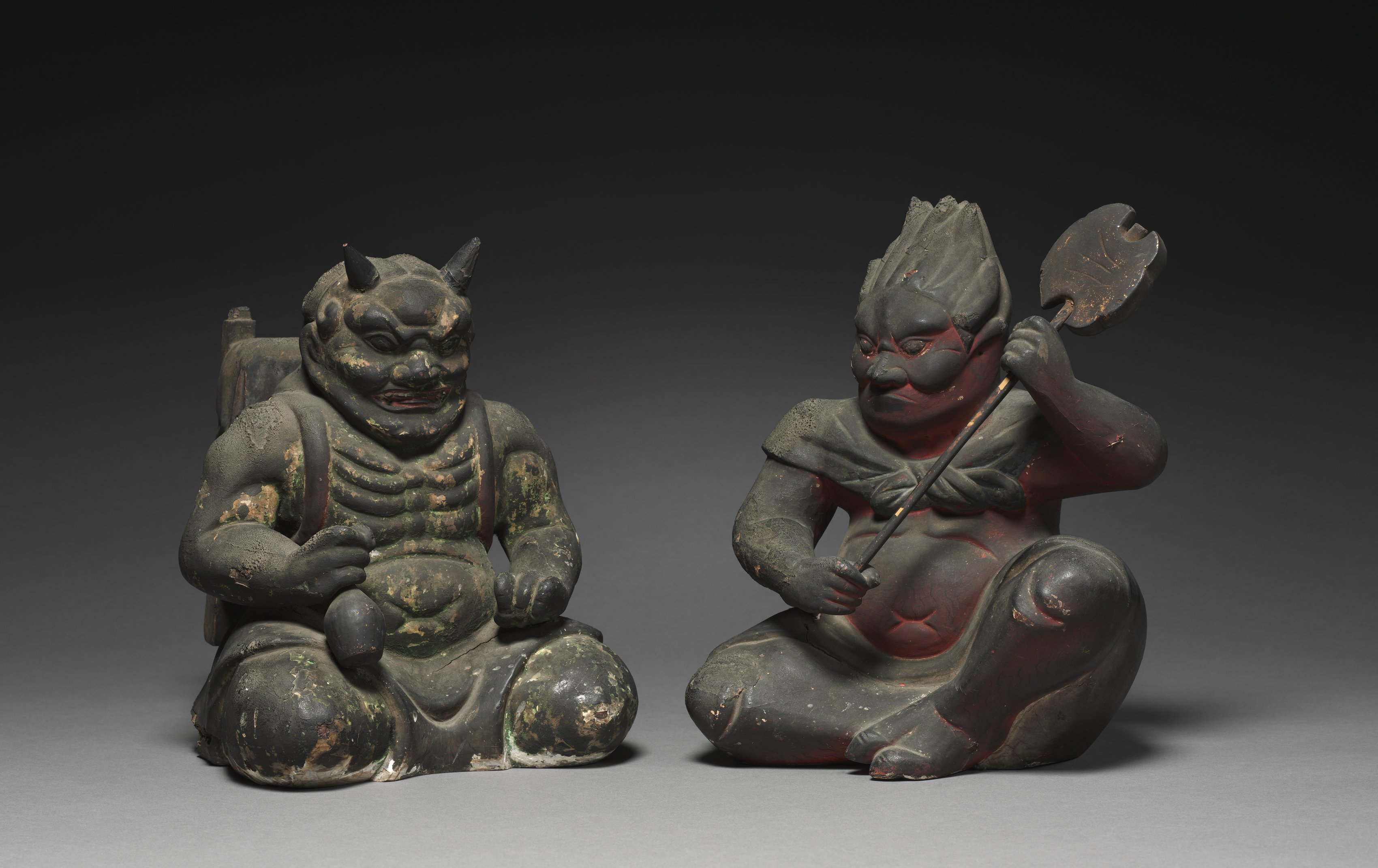 Two dark gray statues of seated men. The man on the left has two horns on his head and a large belly. He is sitting cross-legged with his hands on his knees. The man on the right has a large head of hair and is holding a club-like object with a flat end in his right hand. He is sitting cross-legged with his left hand on his stomach. Both statues appear to be weathered. The background is dark gray.
