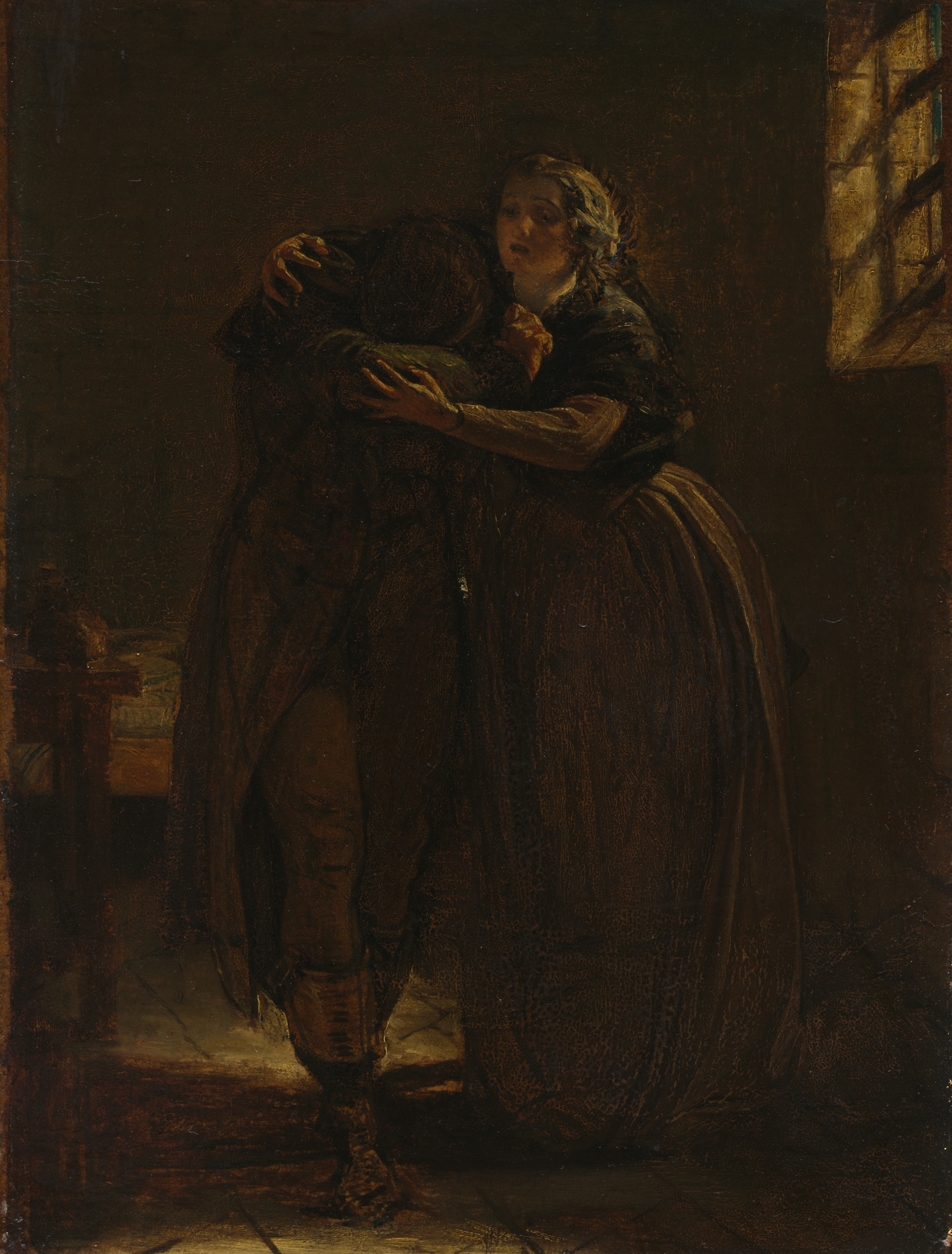 Dark brown painting of a woman embracing a man from behind. The woman wears a long dark dress. The man wears a hat, a shirt with billowy sleeves and loose-fitting pants. The woman's right arm encircles the man's waist and her hand rests near his right shoulder. Her left hand rests on his right forearm. Their heads are tilted to the left. A table with objects on top is on the left. A window with a grid of small panes is on the right. The room appears dimly lit.