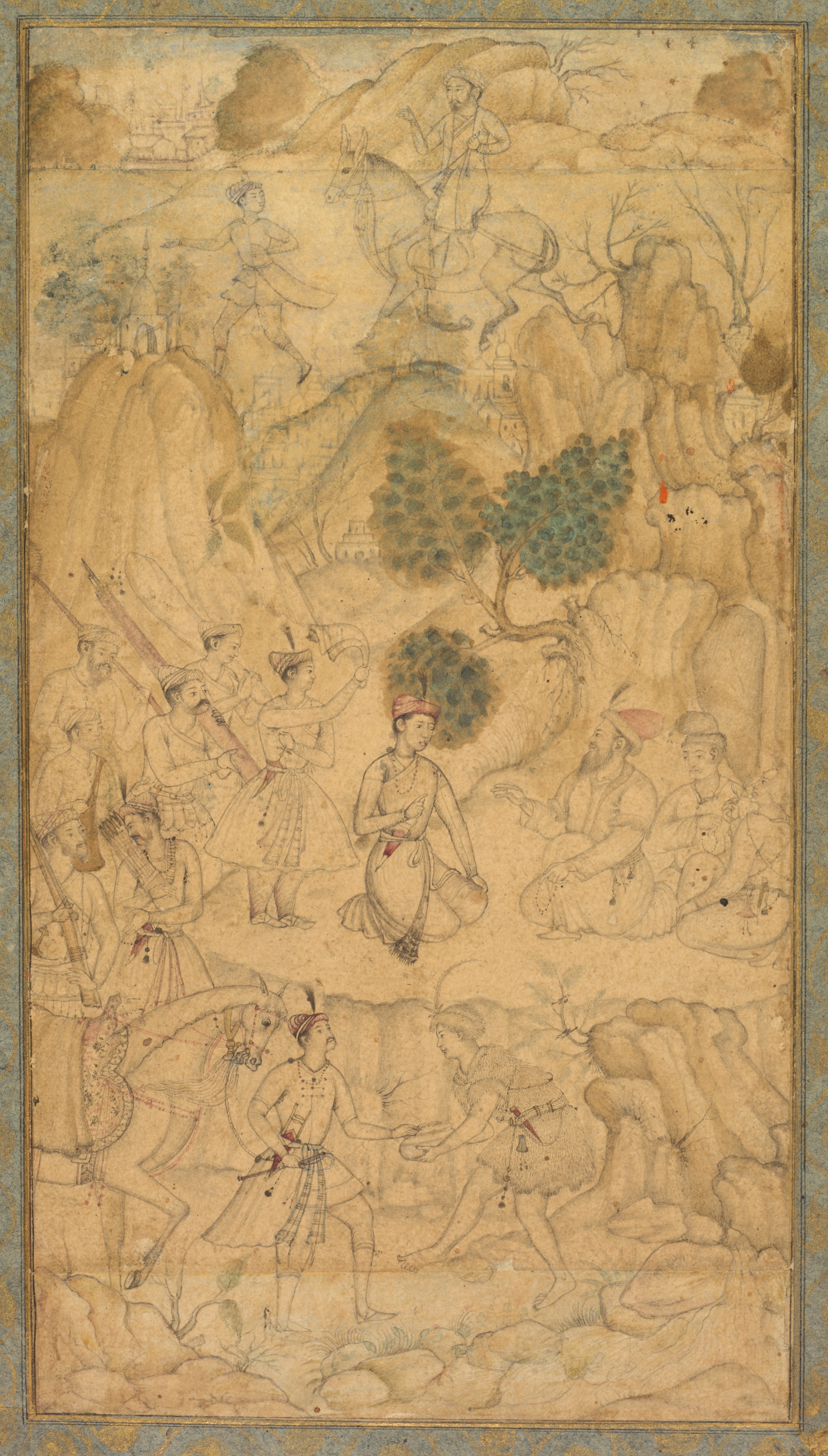 The painting depicts a rocky landscape with a group of people. A man on horseback is at the top center. He wears a turban and a long robe. A figure on foot leads the horse by the bridle. The man on horseback faces right. The rocky landscape has some trees and a few buildings in the background. In the foreground, a man sits cross-legged on the ground, wearing a red turban and a long robe. He faces right. To his left, two men sit on the ground. One wears a red turban, and the other wears a turban and a long robe. Several other figures are scattered throughout the scene. Some wear turbans and long robes. One man leads a horse. The border of the painting is ornate and gold. The background of the painting is yellowed with age.