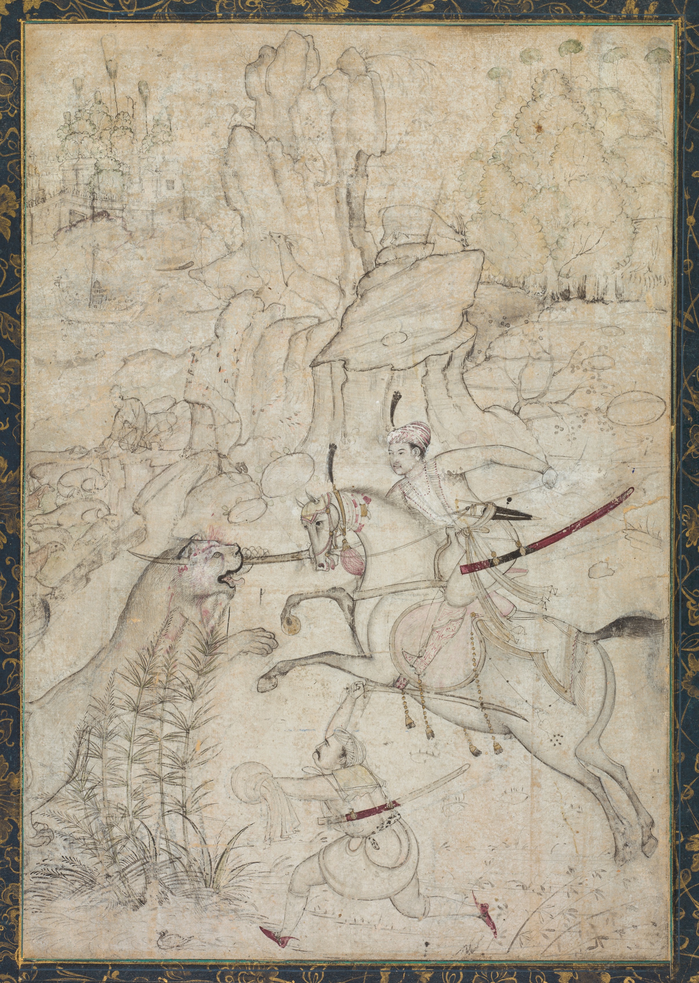 A Mounted Prince Hunting Lion in a Rocky Landscape