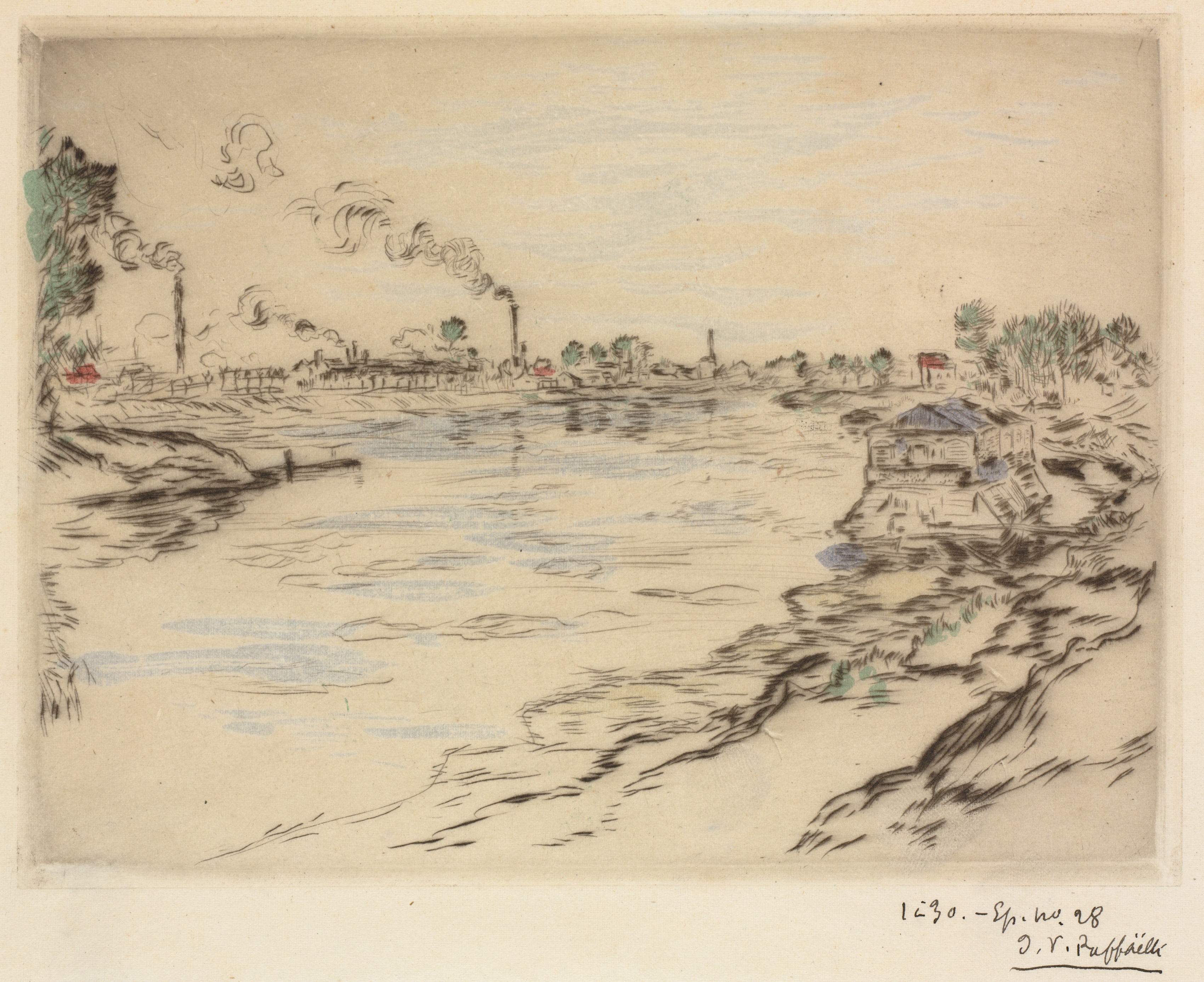 The painting depicts a river scene. The river is on the left half, with a sandy shore on the right side. The river water appears blue with lighter reflections. The shore on the right is sandy with grass. There are trees on the far right and left. Buildings are present on both sides of the river in the distance. Smoke billows from two chimneys on the left. The sky above is blue with clouds. The overall color of the painting is sepia. The artist's signature and date are in the bottom right corner.