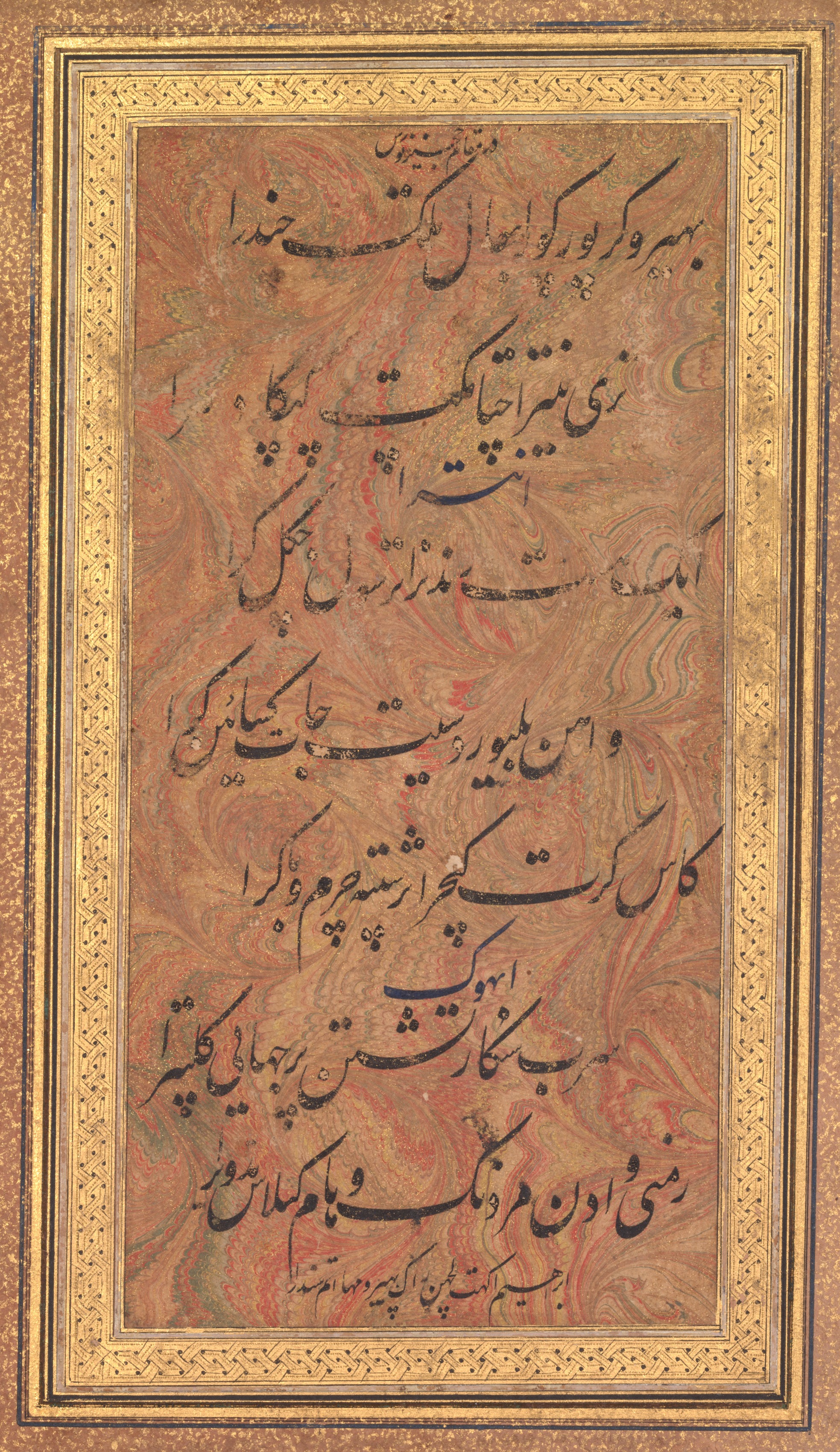 Calligraphy from a ghazal of Fakhr al-Din Iraqi (Persian, 1213–1289) and a verse from the Tuhfat al-ahrar (The Gift of the Free) of Abd al-Rahman Jami (verso)