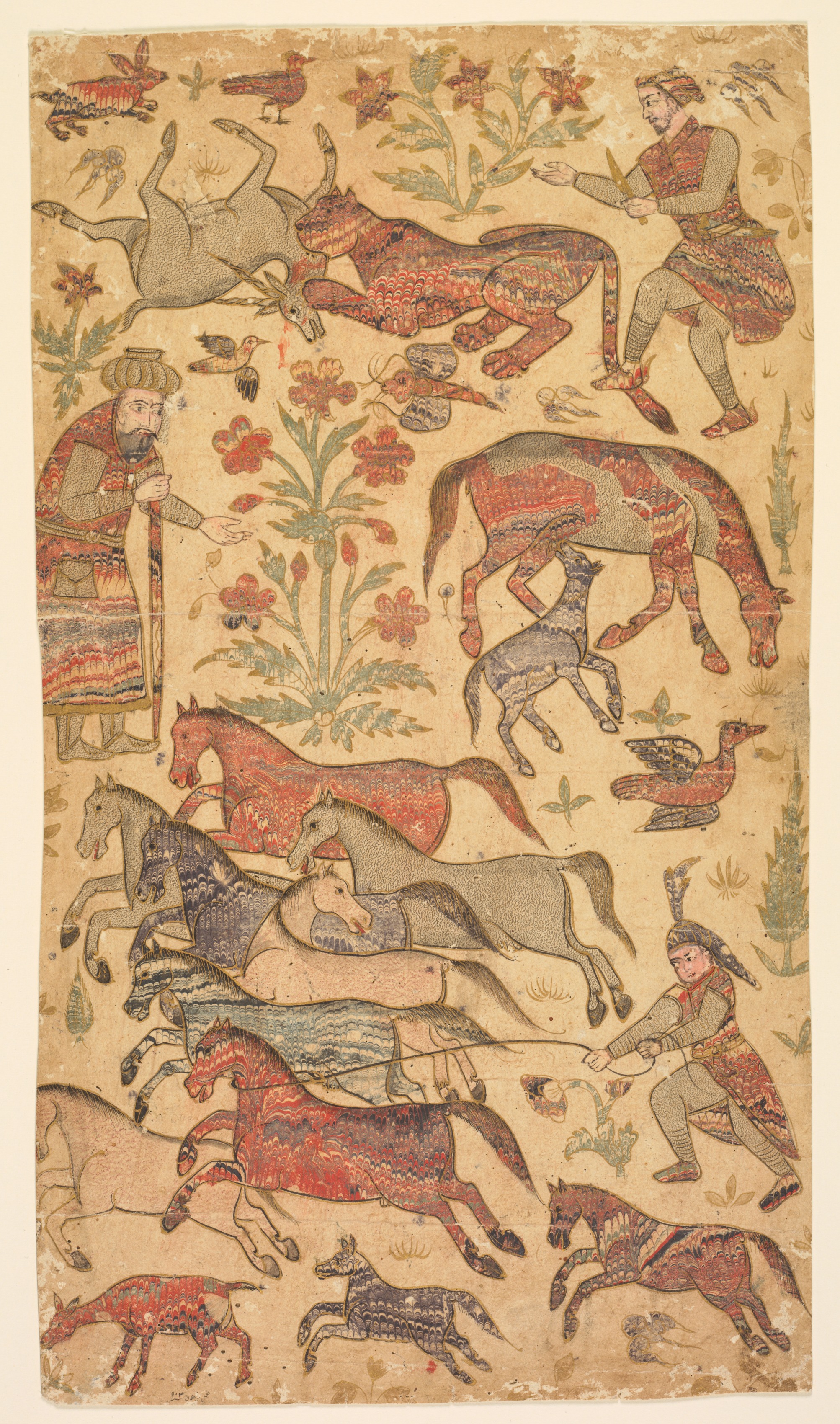 A rectangular artwork with a beige background and a thin beige border. The artwork depicts a scene with multiple men wearing a hat and long tunic and pants. One man on the left holds a long object to his mouth; another to the right is bending down to pick up a fallen man. The fallen man wears a head covering and a long tunic; another man on the top right grabs the tail of a large horse with ornate patterning. The artwork features about 16 horses and horse-like creatures in various shades of red, brown, and gray. Some horses have ornate patterning; several birds are scattered around, and some are flying; flowers and plants are also present. The image includes shades of red, blue, green, beige, and brown.