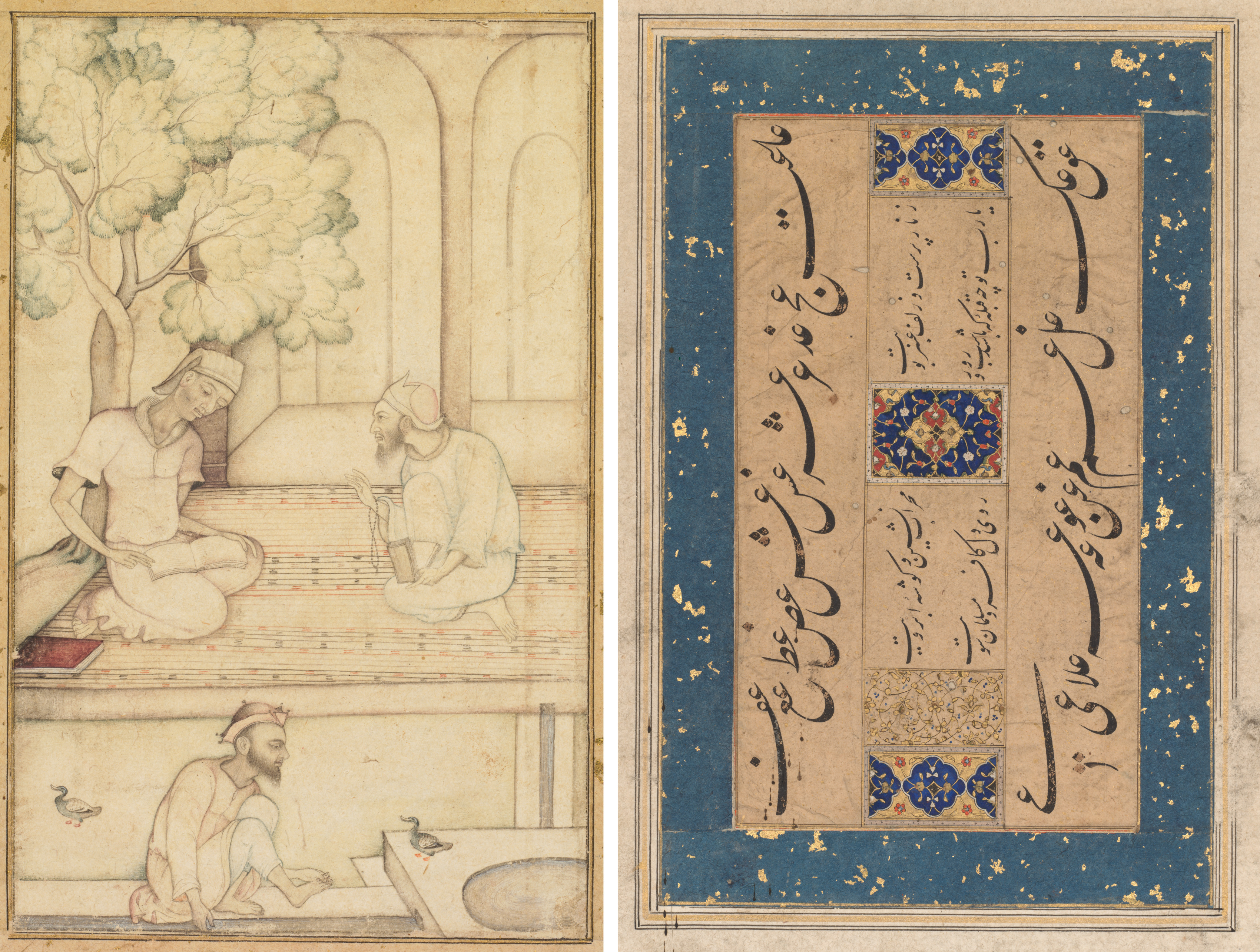 Recto: A drawing of three men on a flat surface outdoors. Two of the men are on a higher platform, sitting cross-legged facing one another; both wear white hats. The man on the left sits with legs tucked under body; the man on the right sits with legs crossed. A tree to their left. The third man on lower platform on right, sitting on the floor with legs tucked under body. Verso: Calligraphy on beige background surrounded by blue border. Border has gold spots. Calligraphy written in black ink. Four decorative squares within border.