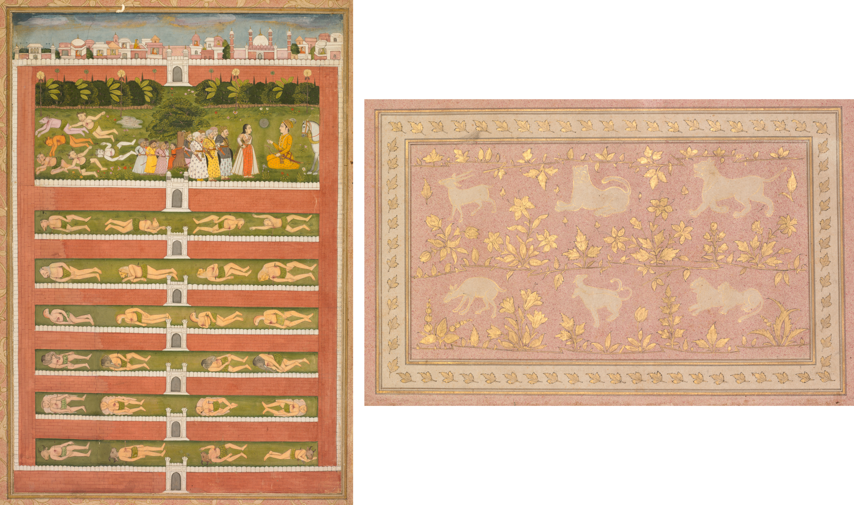 A Princess and Demons before a Nobleman: A Leaf from a Poetical Romance Relating to Shah Alam I (recto); Stenciled Scenes of Lion and Gazelle (verso)
