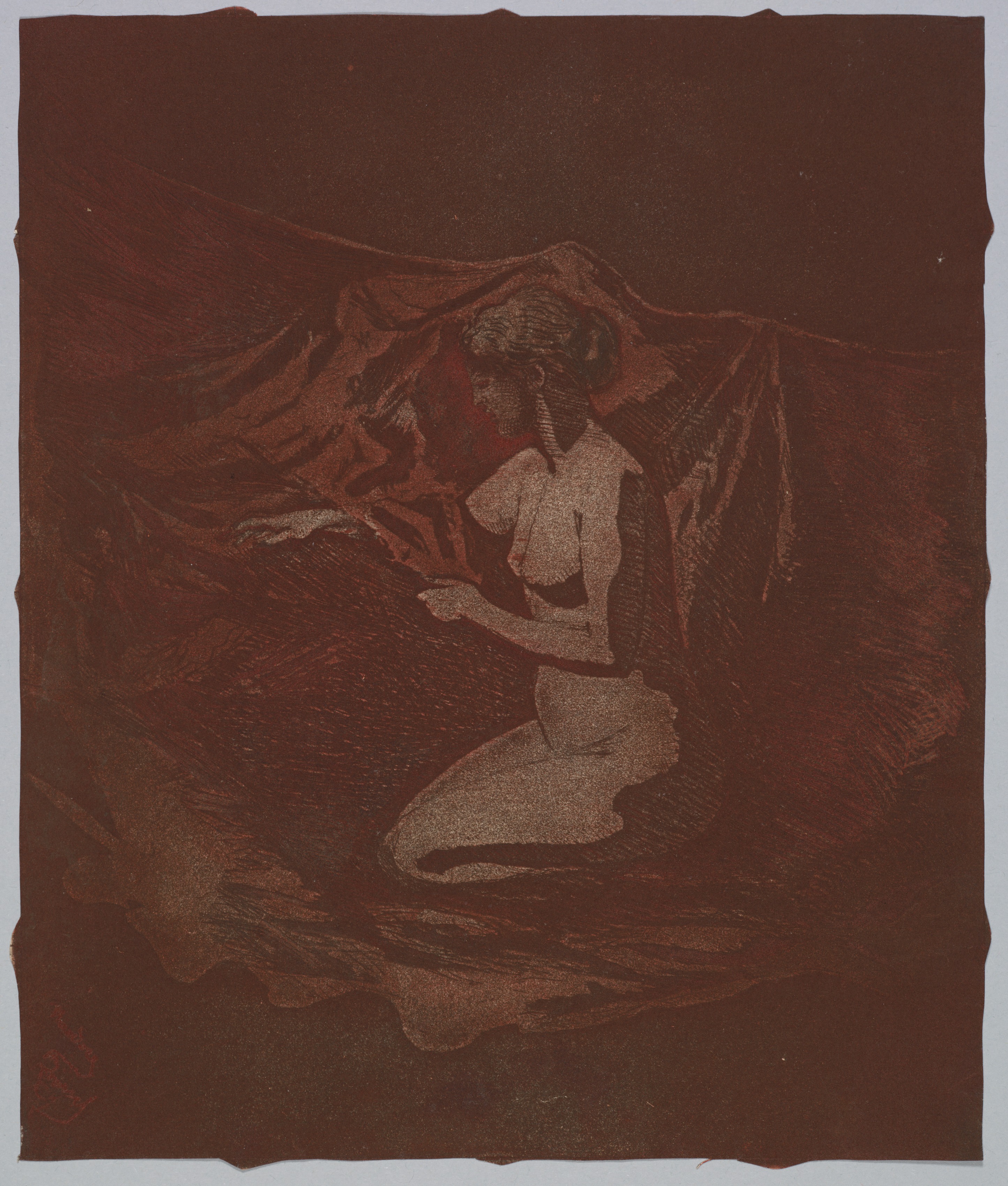Embers Glow by Theodore Roussel depicts a woman kneeling on one knee. She wears a short-sleeved top and a skirt. The woman's hair is styled in a bun. A large, flowing drape or fabric is behind and around her. The fabric appears to be red-brown with folds and creases. The woman's body and fabric are shades of light brown against a darker brown background. The artwork's edges are rough and uneven. The woman's right hand is extended. The overall color tone is muted with shades of brown dominating the scene.