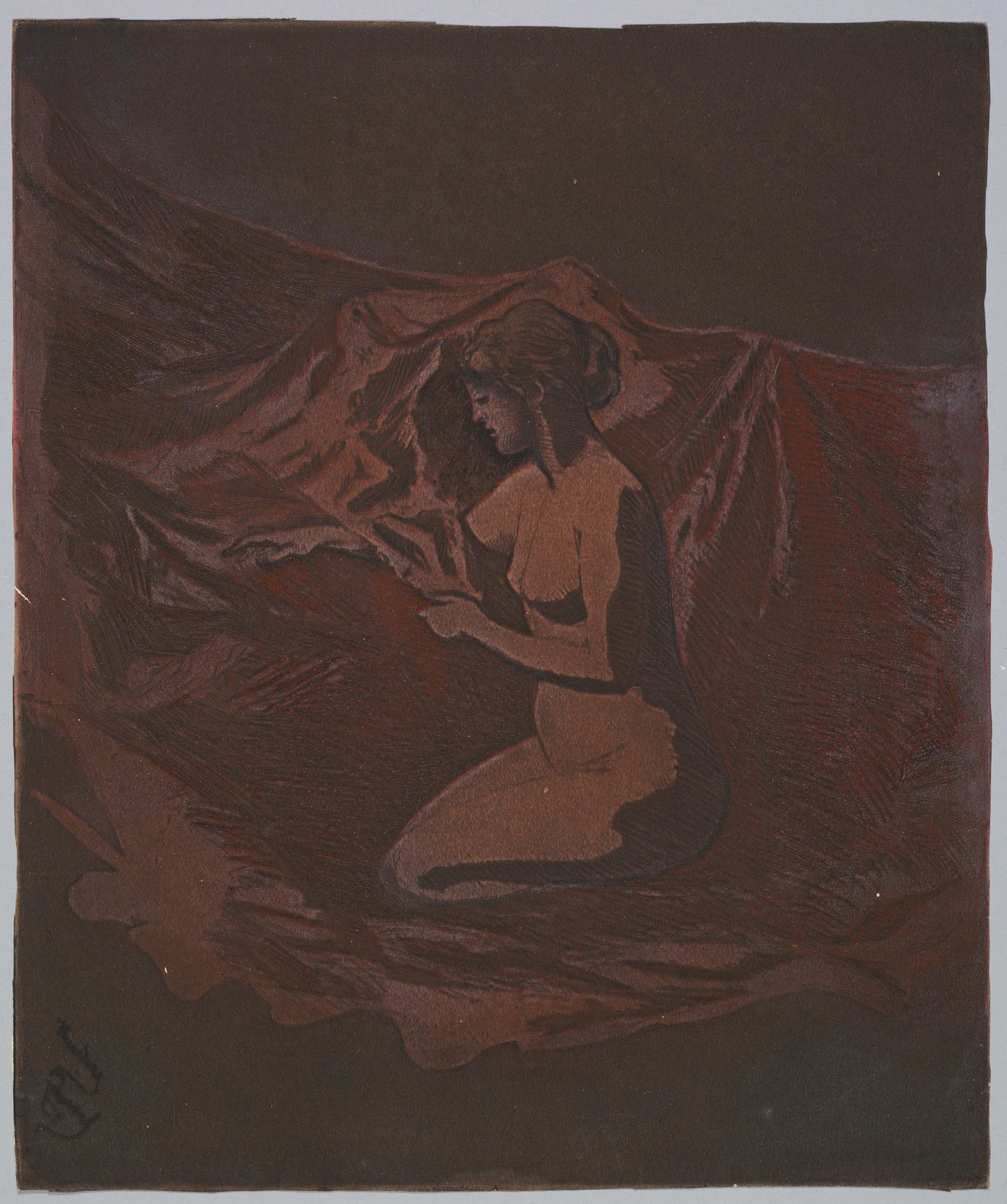 Embers Glow by Theodore Roussel depicts a woman sitting on her knees. She faces left, her body shown in shades of light brown. The woman has short hair and wears a short-sleeved dress. A curtain behind her appears to wave or blow in the wind. The background is dark brown. The overall color palette includes various shades of brown.