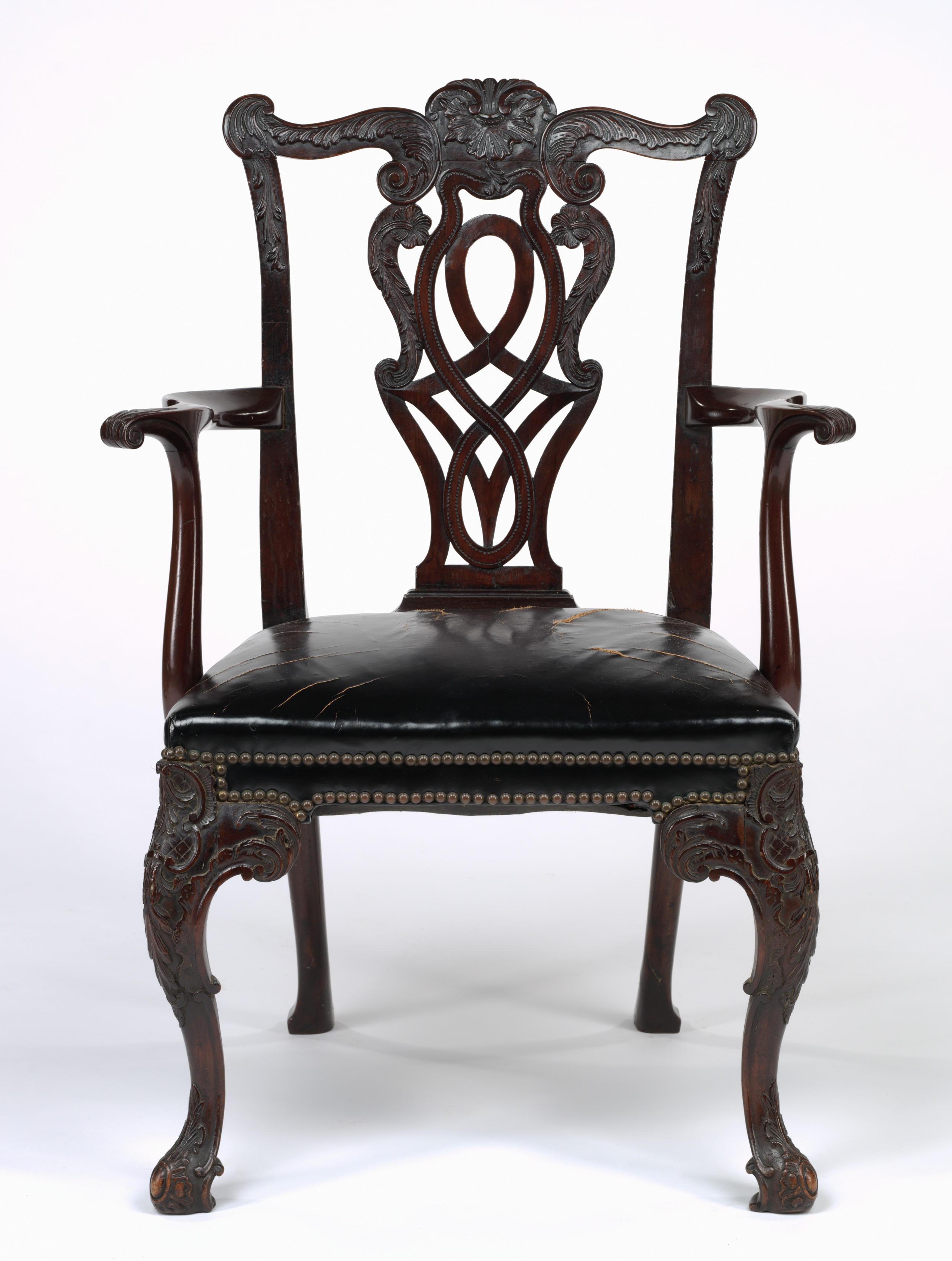 Dark brown wooden armchair "Armchair" by artist Gillows. High back with curved top rail featuring carved floral design. Backrest has intricate latticework carvings. Armrests are curved and flat on top. Seat is upholstered in black leather with brass studs around edges, showing signs of wear with scratches and cracks. Four curved legs with ornate carvings at top and bottom. Feet are curved and tapered. Background is white.