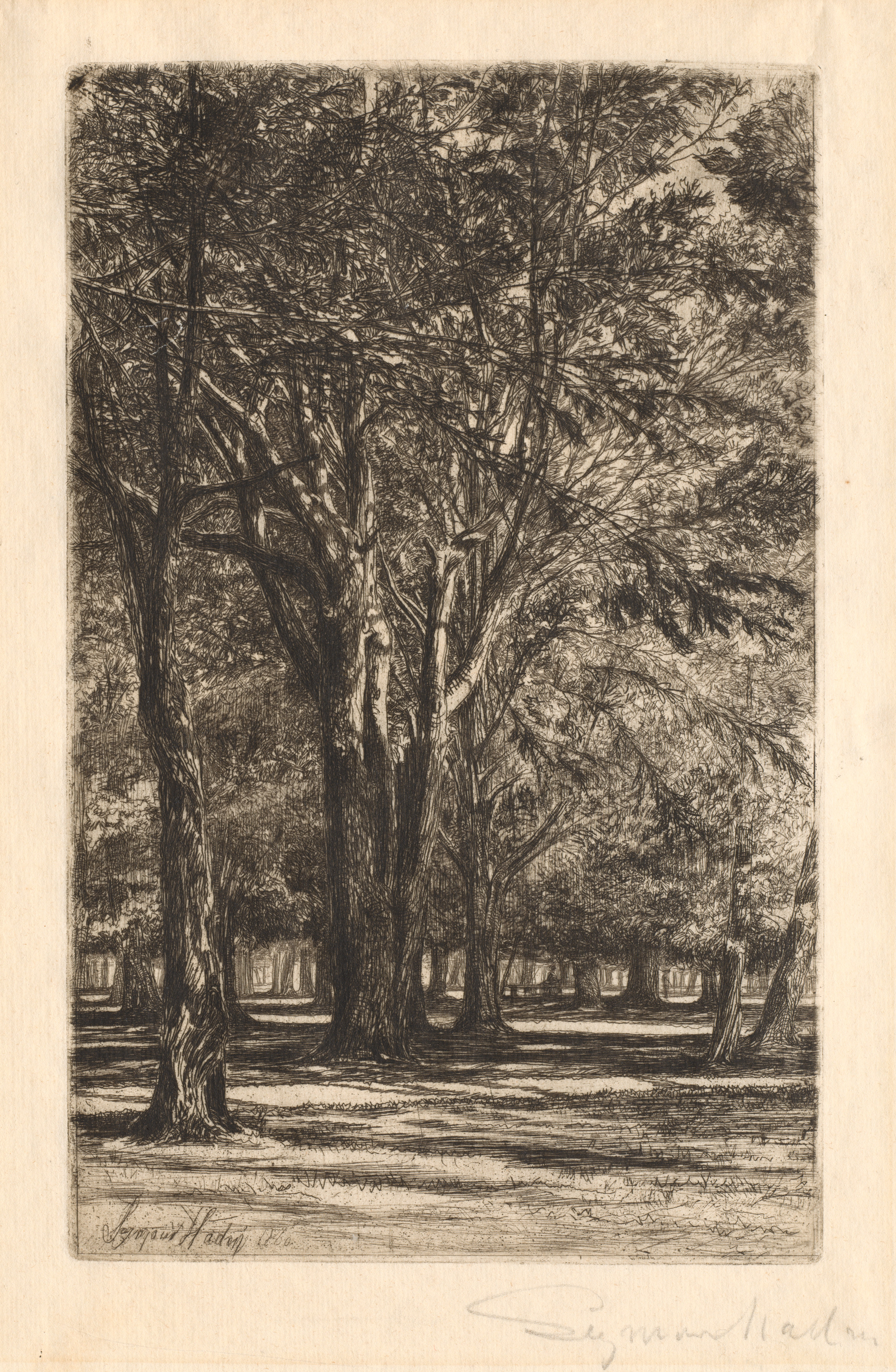 Black and white etching of a forest scene with several trees in the foreground and background. Trees have thick trunks and branches with leaves. The image is dark with some lighter areas suggesting sunlight filtering through the trees. The artwork is signed in the bottom-left corner in dark ink and in the bottom-right corner in light pencil. The artwork has a light-colored border around the image.