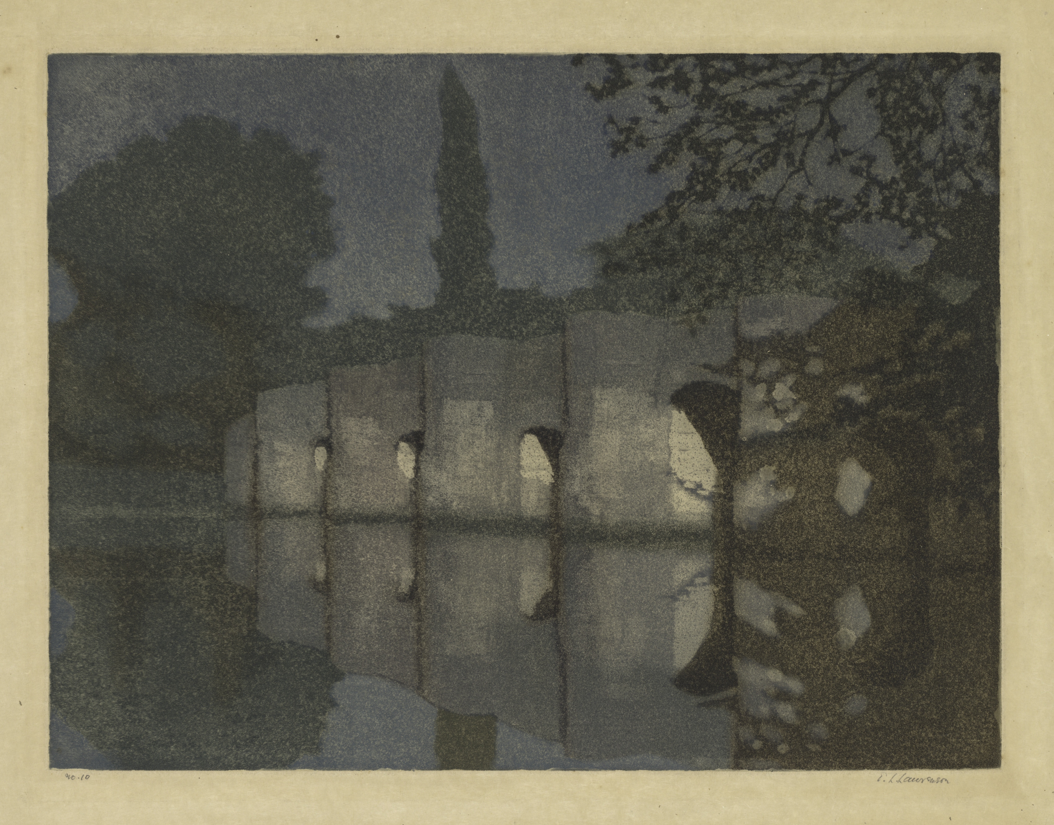 Dark gray and black landscape with a bridge over water. The bridge has several arches and appears to be made of stone. The water is calm, reflecting the bridge and the surrounding trees. Trees are visible on both sides of the bridge, with one large tree on the left and branches on the right. A tall, thin tree is in the background. The sky is dark gray. The artwork is signed in the bottom right corner. The artwork is on a beige background.