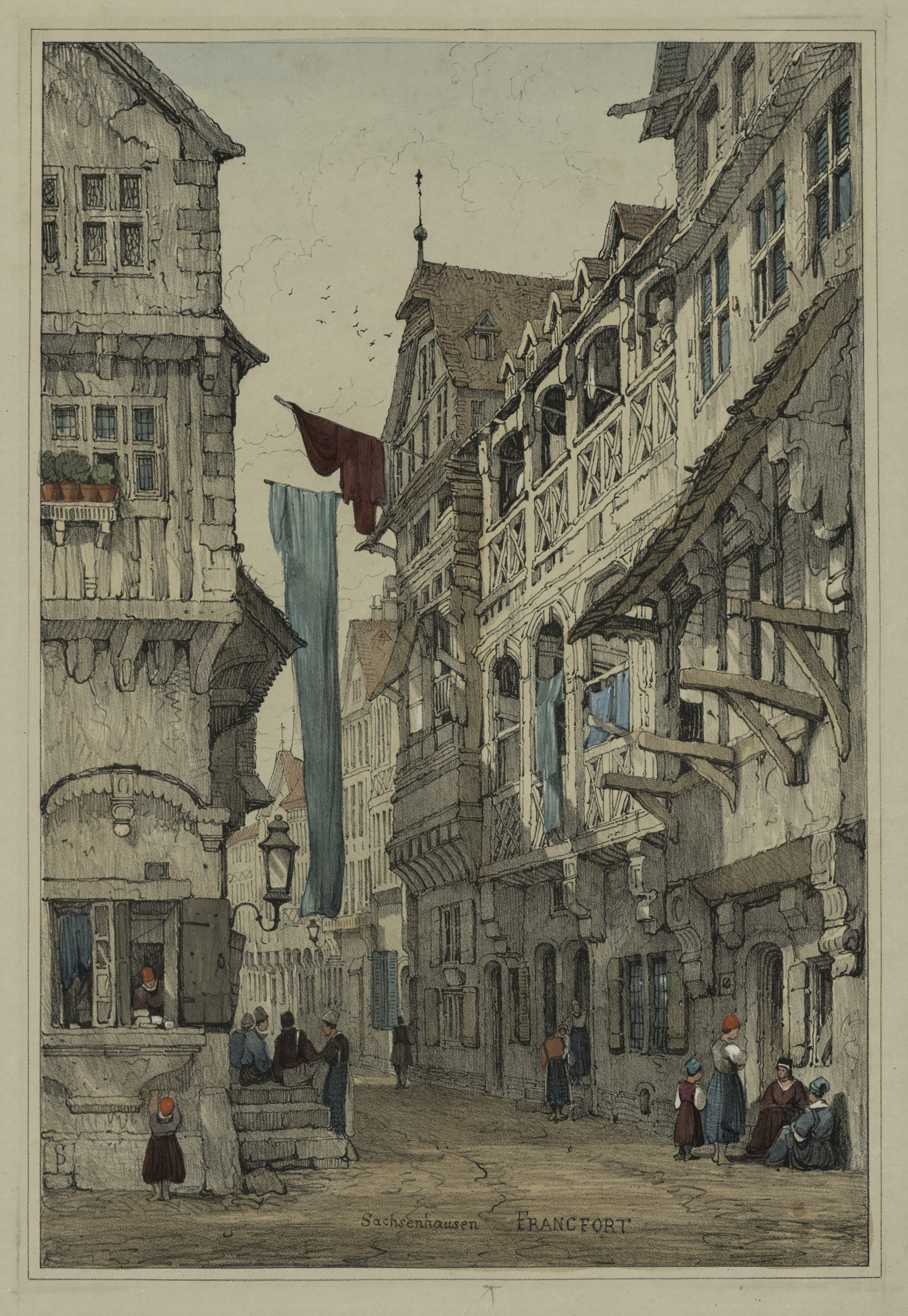 The image shows a street scene with old European-style buildings. The buildings are tall and made of stone with some wood; they have many windows and steep roofs. The buildings on the right have half-timbered facades. There are people on the street and on the sidewalk, dressed in old-fashioned clothes. Some of the people are wearing hats. The street is made of dirt or cobblestones. A blue and a red flag are flying on a pole. The sky is cloudy. The words "Sachsenhausen Francfort" are written at the bottom.