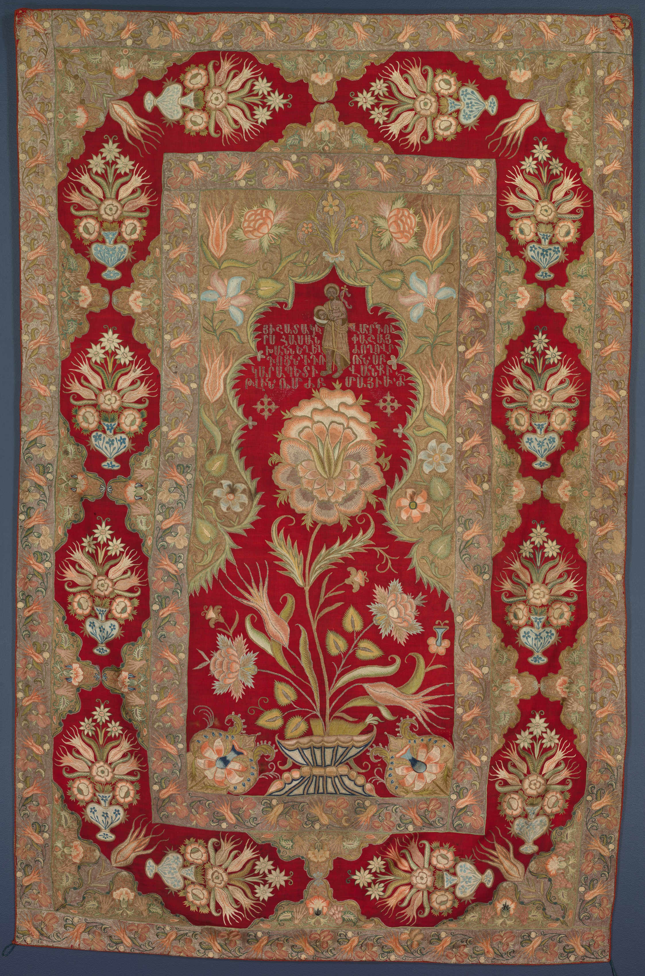 Red fabric with embroidered gold, beige, peach-colored, blue, and green designs. The fabric is rectangular with an elaborate floral design in the center. The center design features a large flower with long stems and leaves. Above the flower, there is a red section with Armenian text. The central design is surrounded by a gold border with a floral pattern. The border is then surrounded by eight red sections, each containing a floral design with a vase. The outer edge of the fabric has a gold border with a leafy pattern. The overall design is ornate and intricate, suggesting that it is an Armenian liturgical curtain.